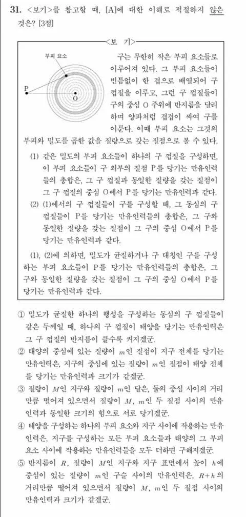 하지만 31번의 문항2는 지구와 태양 내부의 점을 설정해서 둘에서 각각 행성을 당기는 힘이 같다고 설명해있다. 문항자체가 보기와 본문밖의 내용을 이야기하니 문항2가 틀린 표현이다.