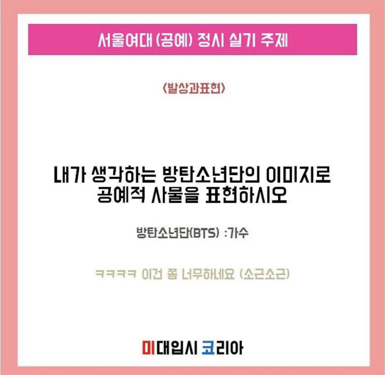 방탄소년단이 무슨 곡을 냈고 무슨 행동을 했는지 안다고 잘볼 수 있는 시험이 아니다. 혹여나 방탄소년단을 모른다해도 그에대한 생각을 이미지로 표현하면 되기에 논란이 될 문제가 전혀 아니다.