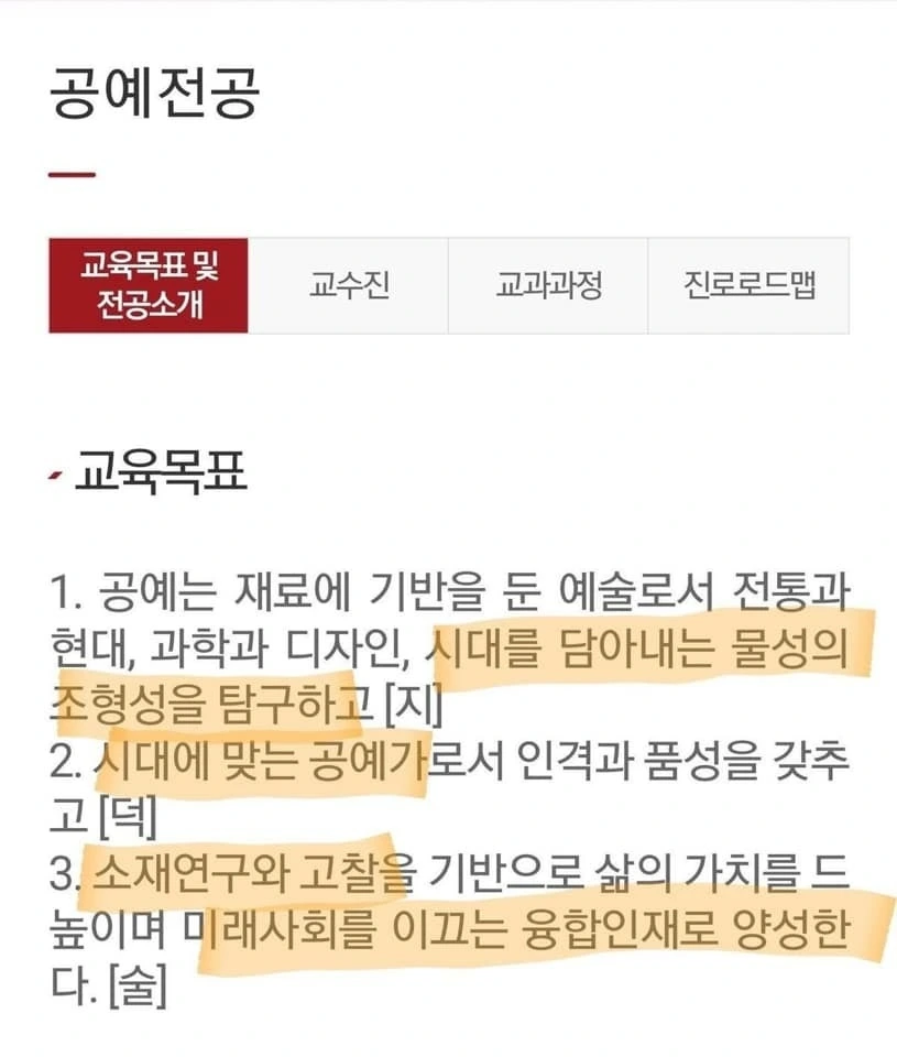 하지만 이 역시 서울여대 공예전공 홈페이지에서 인재상을 검색해보면 옳지않은 비판이라는 점을 알 수 있다. 서울여대 공예전공의 인재상은 시대를 담는 공예가와 소재에 대한 고찰이다.