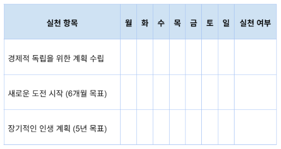 방법: 6개월 안에 달성할 수 있는 구체적인 목표를 세우고 실천 계획을 수립합니다.