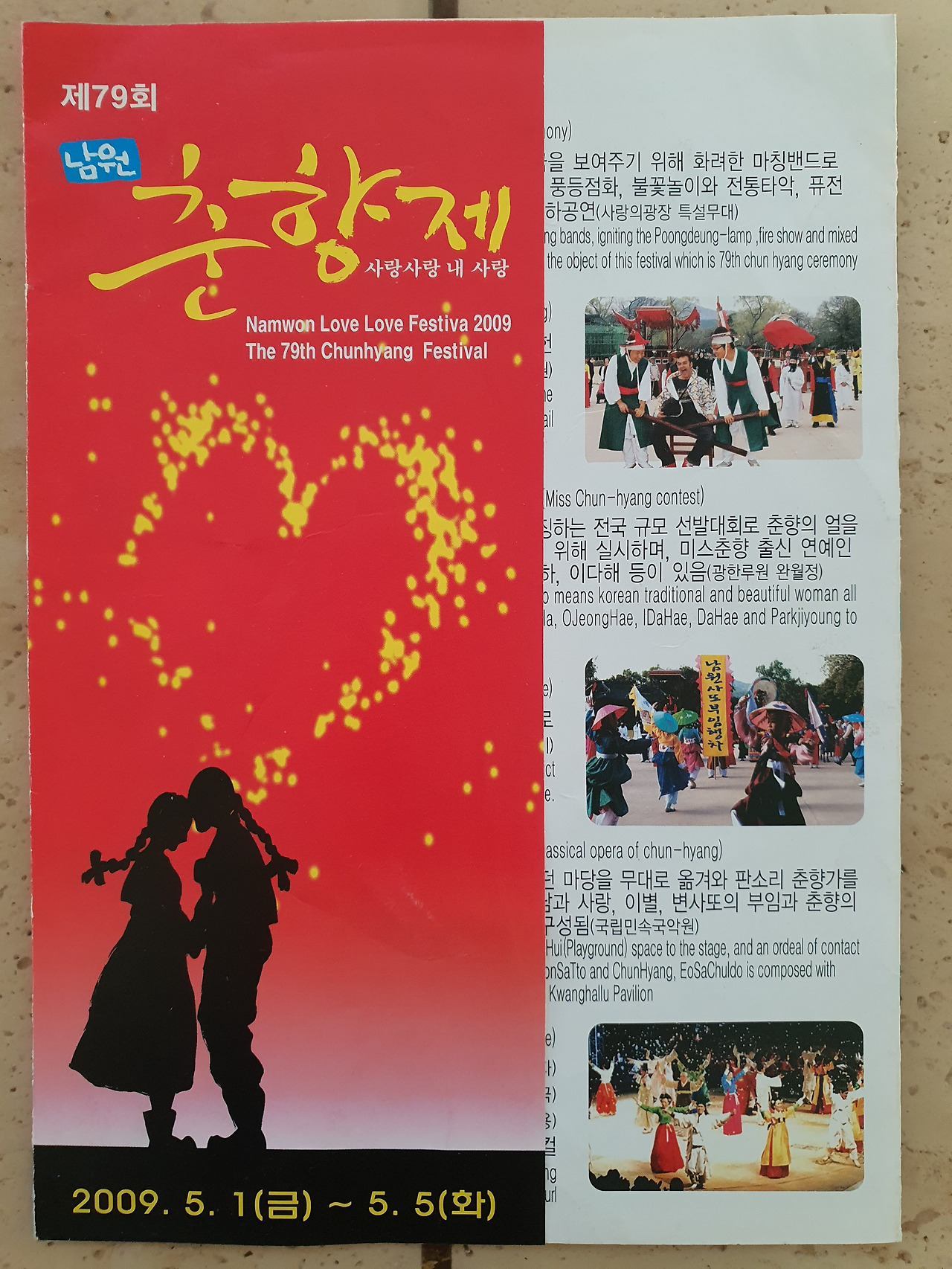 아마 나의 학교 첫 실습. 배우 활동(?)을 해 본 경험이었다. 우리나라에서 유명한 남원춘향제를 교수님께서 연출하셔서 학교 동료들과 스태프로 일하러 가게 되었다. 광한루에서 조선시대 춘향, 몽룡이 살던 시대를 재현하는 상황극을 곳곳마다 했었다. 나는 포졸. 그때도 지금도 생각해보면 웃기고 재밌는 경험을 하고 왔다. 포졸 분장을 하고 방문객들을 끌어다가 상황극에 빠지게 만드는 역할. 방문객들에게 자연스럽게 혹은 무턱대고 다가가 학생회장인 사또에게 고했다. 확실히 방문객들은 웃고 즐거워했다. 그래서인가 이때부터 관객참여형이 중요하단 것을 몸소 배웠던 것 같다. 그리고 남원루 일대를 퍼레이드 하면서 사람들에게 손인사를 건네며 배우가 된 그 기분도 이색적이고 재밌었던 것 같다. 문화 유적지를 오랫동안 누리며 일하고, 처음 먹던 추어탕이 참 맛있어서 잊을 수 없는 남원 춘향제의 기억. 유명한 축제를 함께 만드는 일원이 되었다는 것과 조선시대를 재현한 상황극이 방문객들에게 좋은 호응을 받았던 것. 그래서 나는 전통문화축제 프로그램 아이디어를 낼 때, 시대 재현극을 이야기하게 되는 것 같다.