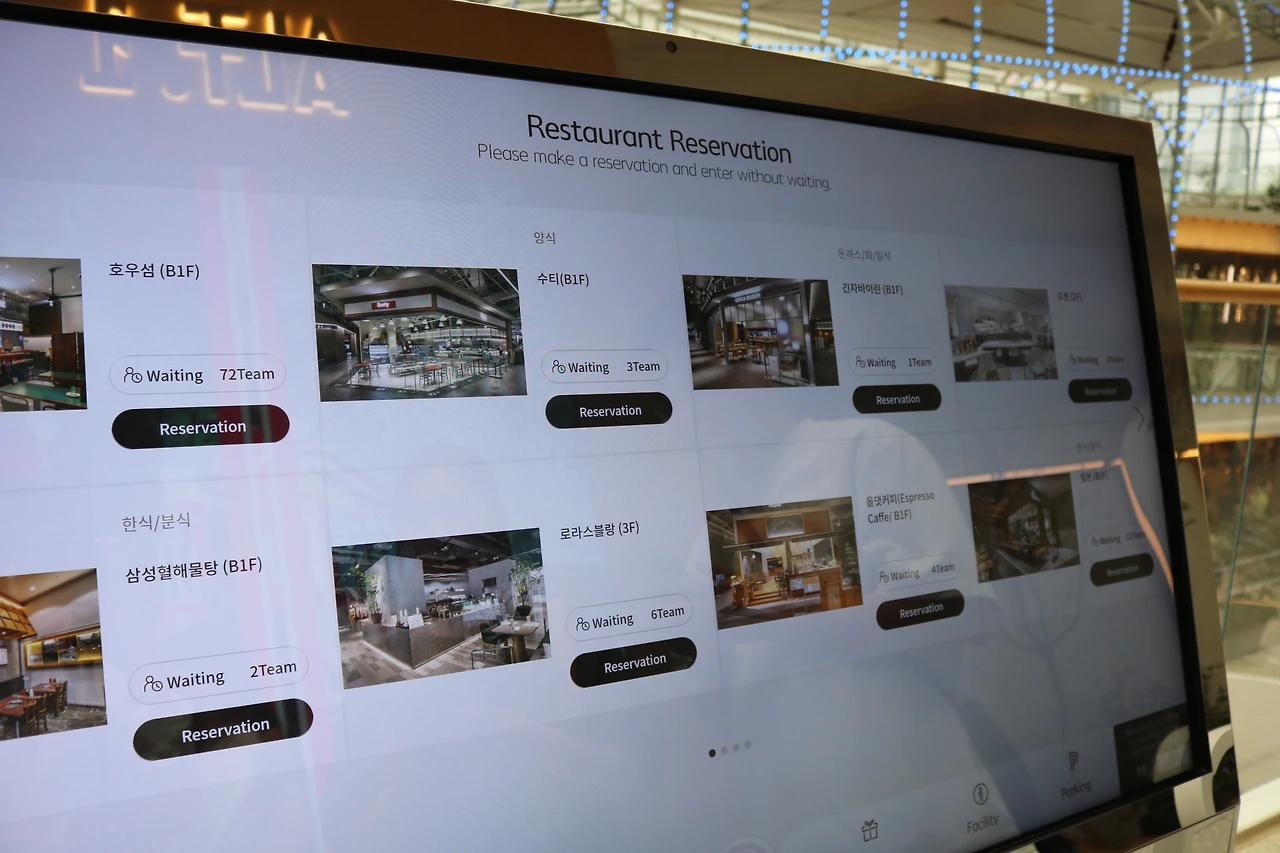 더현대서울에는 유명 맛집들이 많이 들어와있고 그에 따라 웨이팅이 긴 곳들이 많은데요. 굳이 현대식품관 앱을 깔거나 식당앞으로 가지 않아도 이렇게 안내 키오스크에서 예약이나 웨이팅 등록이 가능했습니다. 또한 현재 웨이팅이 몇 팀 남았는지에 대한 안내도 해주고 있어 여러 식당들을 동시에 비교할 수 있어 좋았네요.