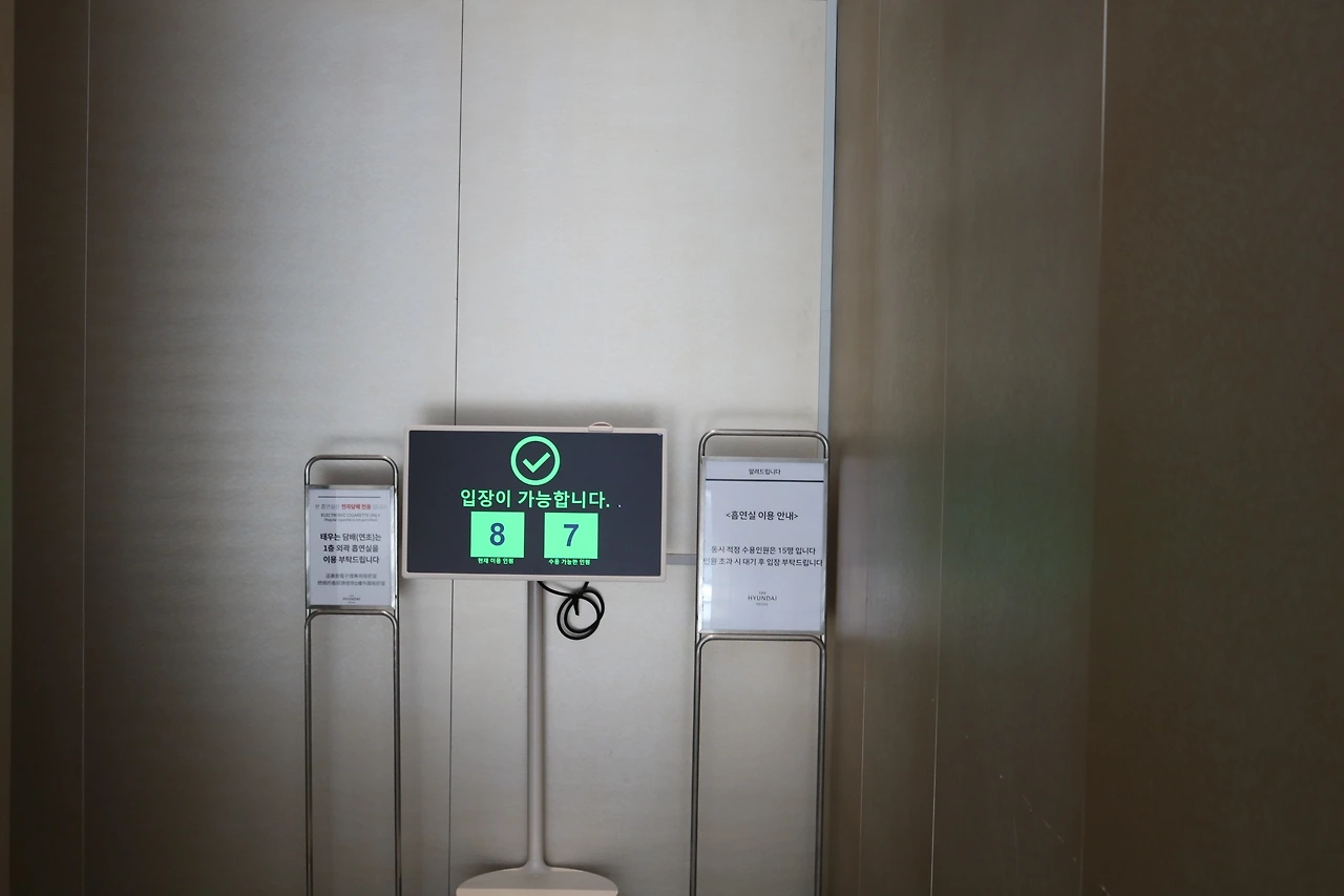 더현대서울 6층에 흡연실이 마련되어있는데요. 흡연실 앞 모니터를 통해 입장 가능한 인원과 현재 흡연실 사용 인원을 표현해주고 있어 사용에 편리함을 더헀습니다. 적정 수용인원이 마련되어있는 점도 좋은 것 같아요.
