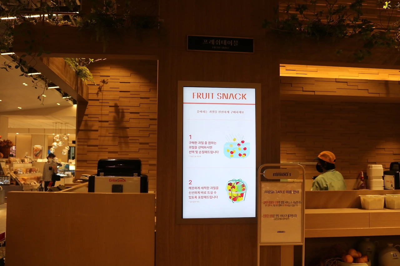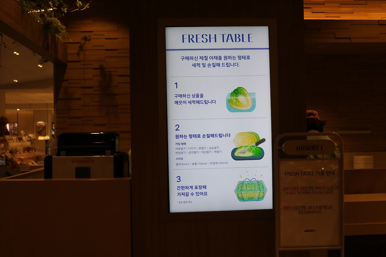 이건 이미 알고 있던 서비스이긴 했는데요, 식품관에서 구매한 과일이나 야채를 원하는 형태, 크기로 손질해주는 서비스에요. 수박 컷팅 서비스로 유명해졌는데 멜론이나 수박과 같이 껍질이 많이 나오는 과일은 물론이고 배추, 무와 같은 야채들도 손질 가능하답니다.