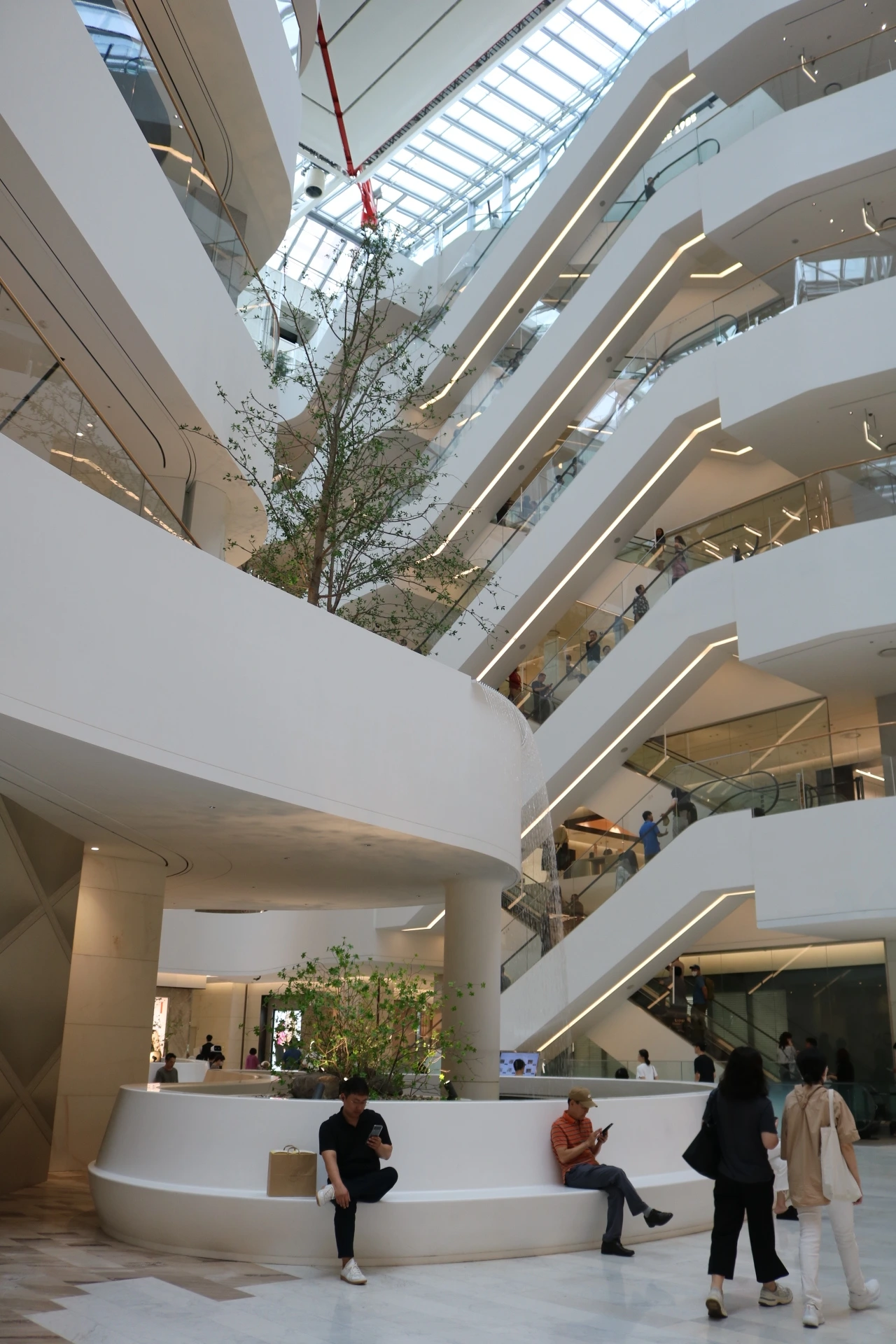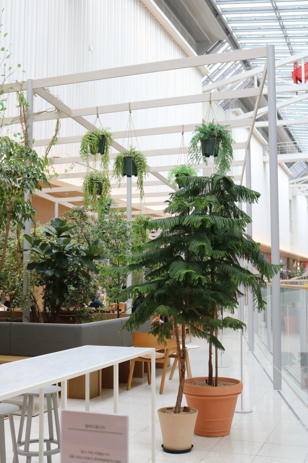 더현대서울에는 휴식공간이 많이 있어요. 곳곳에 의자가 있어 쉴 수 있고 심지어 6층에는 테이블과 의자가 있어 음식을 먹을 수 있는 공간도 있답니다. 적당한 화분들로 가려져있어 아주 개방되었다는 느낌도 줄였죠.
