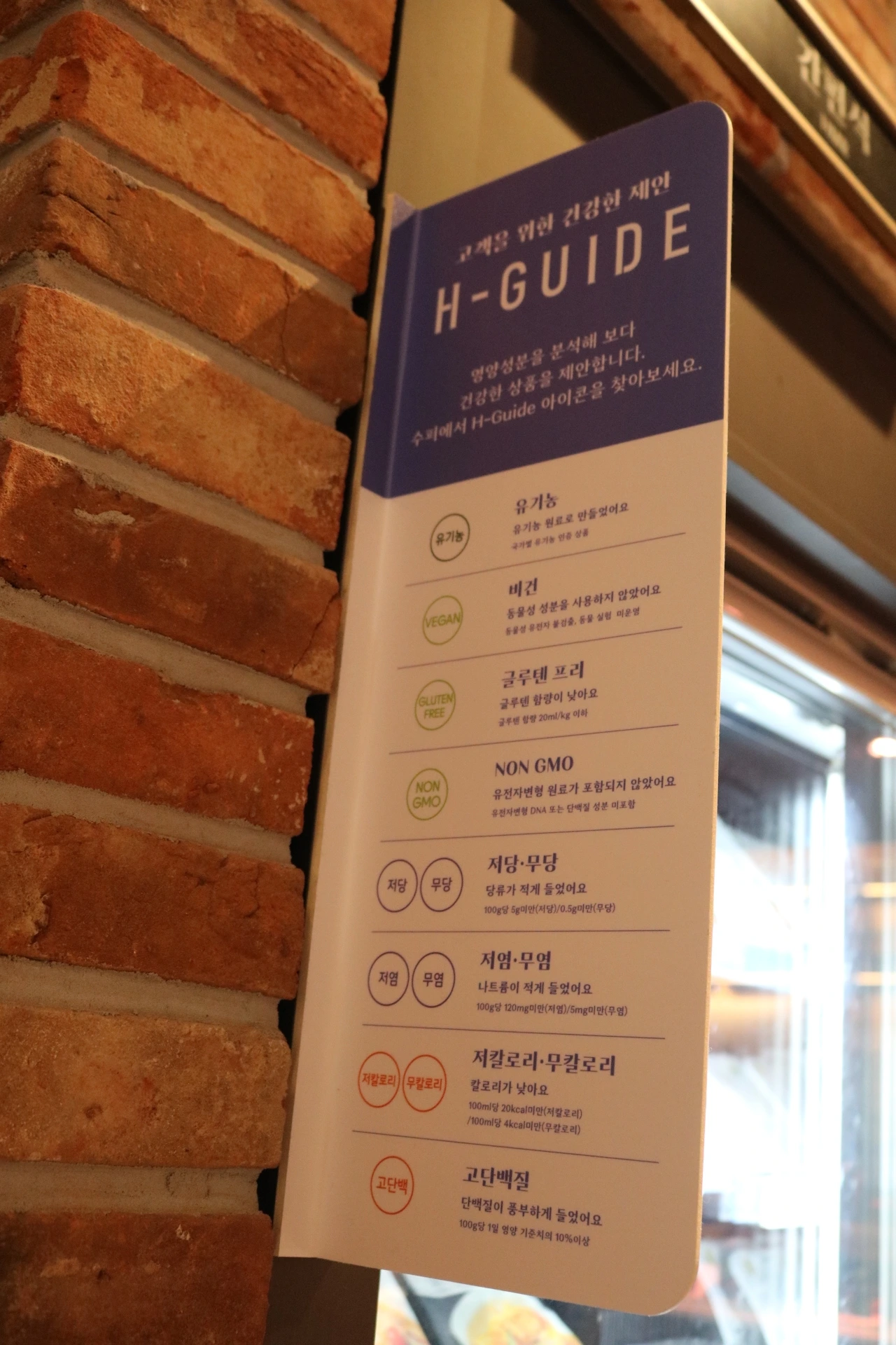 건강과 영양성분에 관심이 많은 고객들을 위한 표기들, 유기농∙비건∙저칼로리와 같이 일일히 영양성분을 보고 분석해야만 파악하는 정보들을 각 상품명 택에 간단한 마크로 표기함으로써 고객들의 불편함을 최소화했어요.