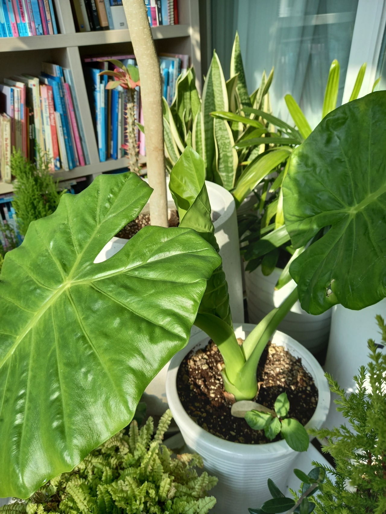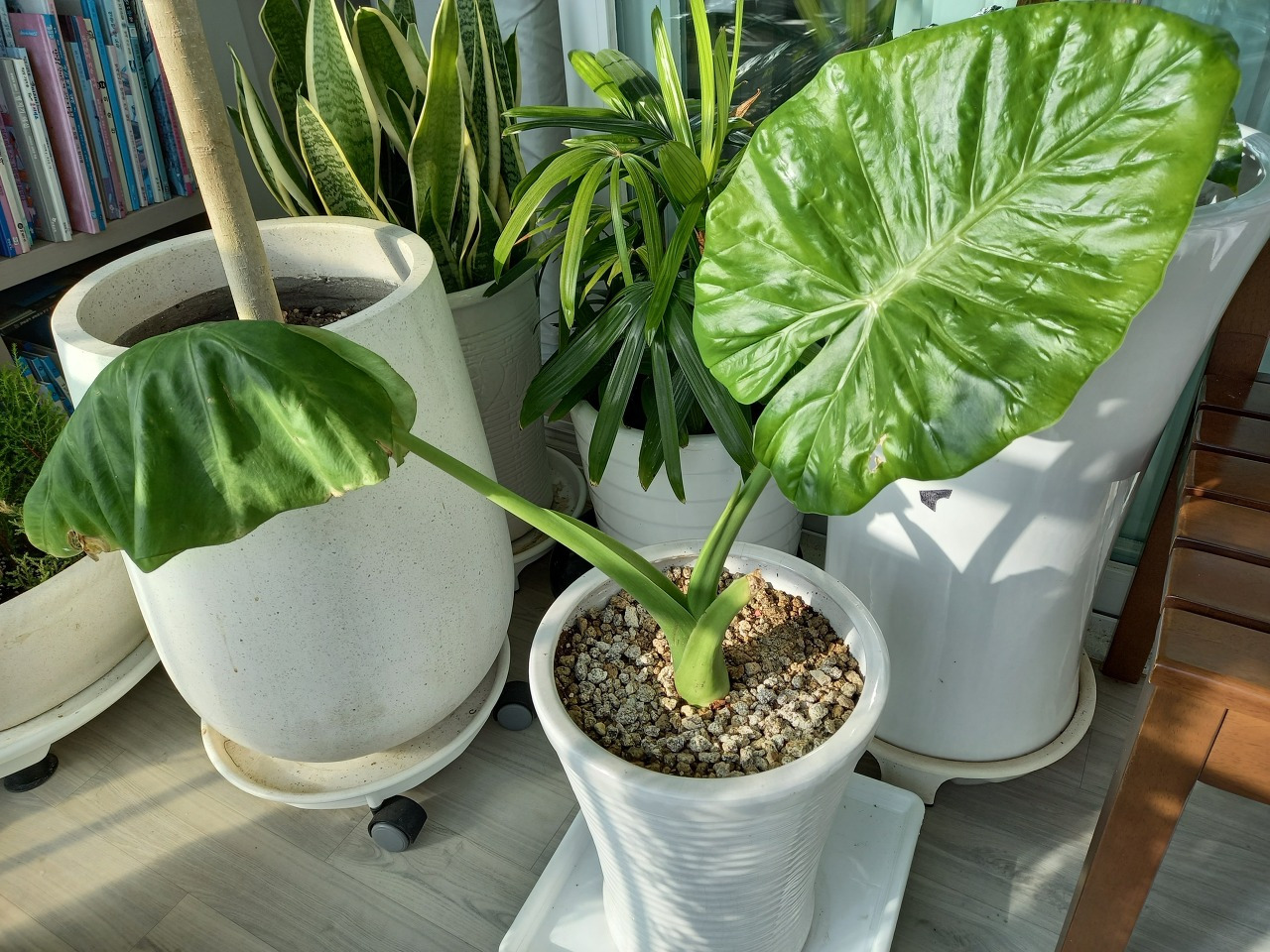 죽은 줄 알고 버려졌던 알로카시아는 단순히 혼자서 살아남기만 한 것이 아니었다. 번식까지 잘해서 한 포기였던 것이 4 포기가 되었고 큰 4 포기 옆에 작은 새끼 한 포기도 크고 있었다. 부모님은 알로카시아가 살아나서 번식까지 한 것이 기특하게 느껴지시고 어찌나 반갑게 여기셨던지 밭에서 캐와서 다시 화분에 심고 싶어 하신 것이다.