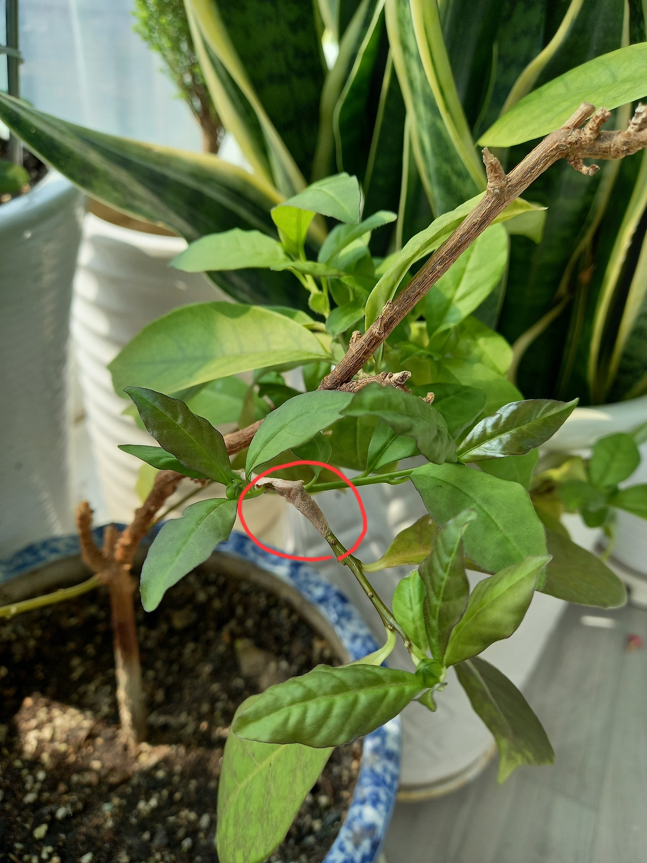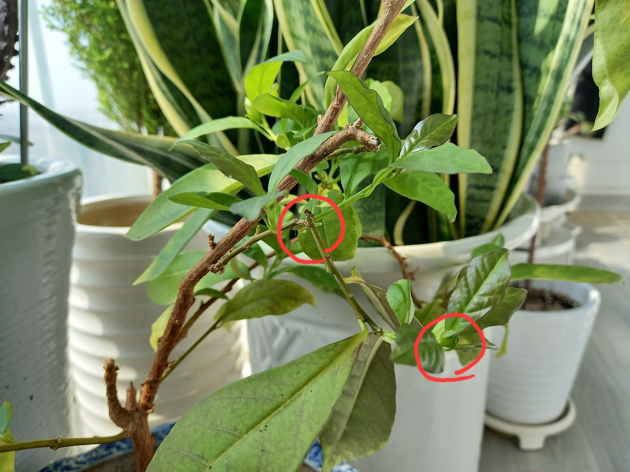 식물에게 물을 주던 어느 날 재스민의 가지가 꺾여 있는 것을 발견했다(오른쪽 사진). 물을 주다가 호스에 잘못 걸려서 꺾인 것 같다. 어쩔 수 없이 가지를 잘라내야겠다 생각했는데 자세히 보니 꺾인 가지 끝에 새 잎이 돋아나고 심지어 꽃봉오리까지 맺고 있었다. 신기하게만 생각하고 바쁜 일상에 아무런 조치도 해주지 않은 채 며칠이 지났는데 여전히 잎도 꽃봉오리도 싱싱하게 달려있었다. 꺾인 후 얇게 남아있는 가지의 줄기로 영양분을 계속 받고 있는 모양이었다. 식물의 생명력에 놀라지 않을 수 없었다. 스스로를 돕는 식물에게 나도 작은 도움을 주고자 종이 반창고를 붙여주었다(왼쪽 사진). 꺾인 가지 끝 꽃봉오리에서 꽃을 피우는 날의 감격스러움을 기대해 본다.