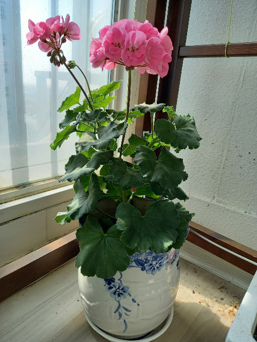 시어머니가 주신 제라늄의 잎을 하나 따서 흙에 꽂아놓았더니 1년 후에 이렇게 큰 제라늄이 되었다. 꽃이 얼마나 예쁘고 화려한지 꽃대의 꽃이 모두 다 피면 마치 꽃다발 같다. 온도와 습도가 잘 맞으면 1년 내내 꽃을 볼 수 있다. 꽃대의 꽃이 모두 지고 나면 다른 꽃대가 올라와서 또 꽃을 가득 피운다.