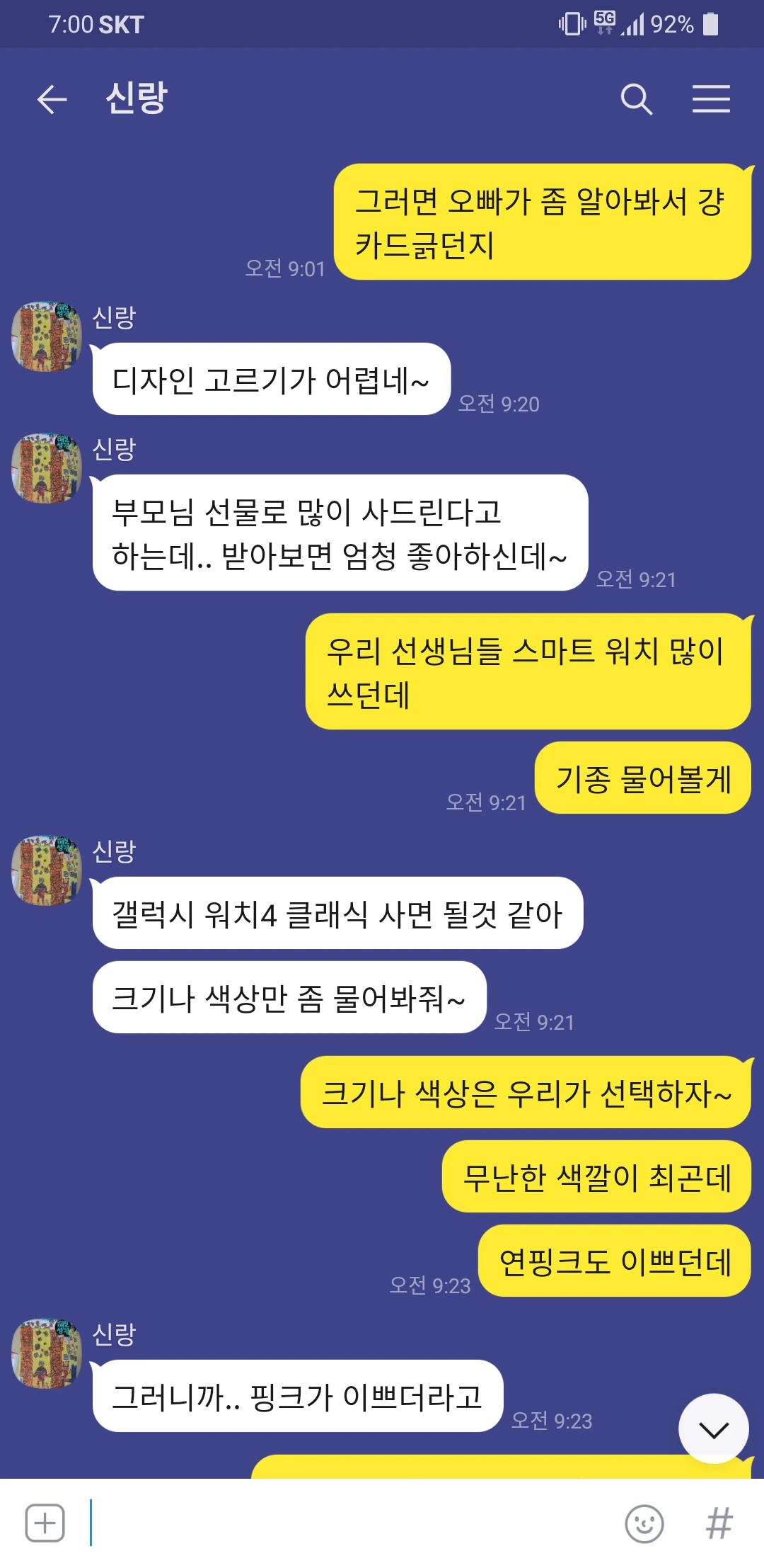 5월 8일 어버이날이 되었다. 미친듯이 남편과 회의 돌입. 어떻게 할까. 어머님이나 울 엄마나 이번에 용돈을 드리냐 선물을 드리냐 이말 저말이 나왔다. 신랑은 언제나 물질은 양가 동일하게 하자 주의인데, 문제는 우리가 돈이 없다. 돈이 없으니 돈은 못드리고 결국 선물을 드리기로 했다. 기왕 드리는거 값진 것으로 드리자 한다. 처음에는 목걸이 얘기가 나왔다. 그러다 스마트워치로 변경되어 부리나케 주문했다.
