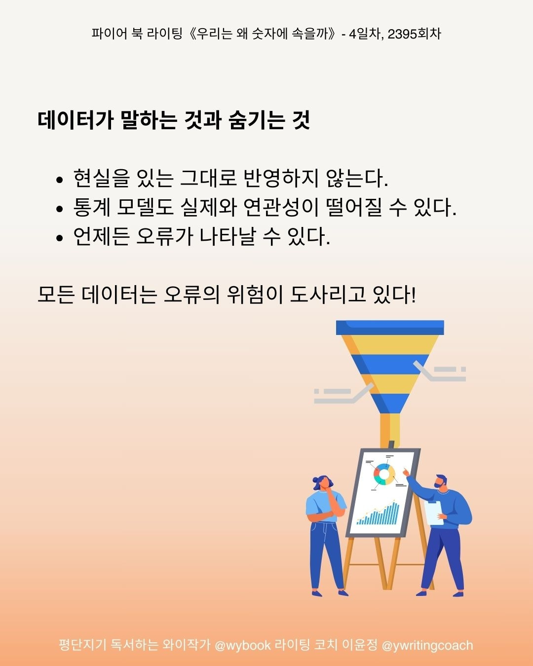데이터는 현실을 있는 그대로 반영하지 않고, 통계 모델도 실제와 연관성이 떨어질 수 있으므로 언제든 오류가 나타날 수 있다.