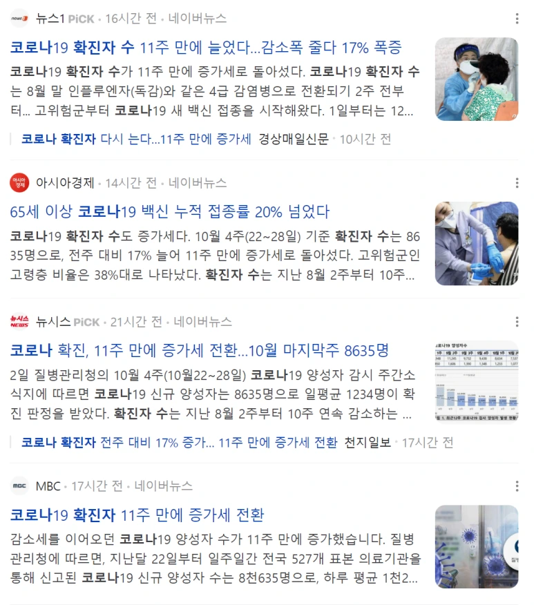 오랜만에 건강관리 측면에서 코로나 확진자수를 검색해 보니 11주 만에 늘었다고 나오는 기사들이 있네요. 감소폭 줄다 17% 폭증했다는 기사, 65세 이상 코로나 백신 누적 접종률 20% 넘었다는 기사만 보고, 아, 코로나가 다시 늘어나고 있구나 생각할 수 있죠.