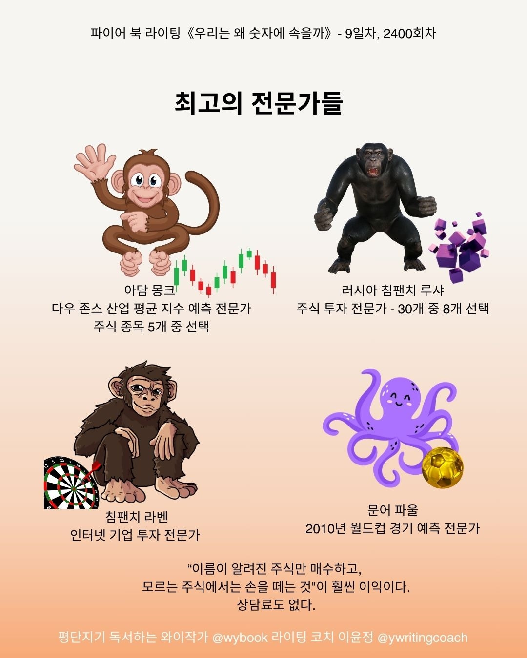 오늘 아침 10분 독서한 부분은 "틀릴 수 없는 예측"에 관한 이야기입니다. 시카고의 아담 몽크 원숭이, 러시아의 침팬지 루샤, 침팬지 라벤, 문어 파울, 대한민국의 앵무새는 어느 전문가 보다 우수한 성적으로 잘 찍는 동물들입니다. 주식 상승률, 경기 우승 확률을 찍으면 오른다! 이긴다! 생각하는 사람이 많죠.