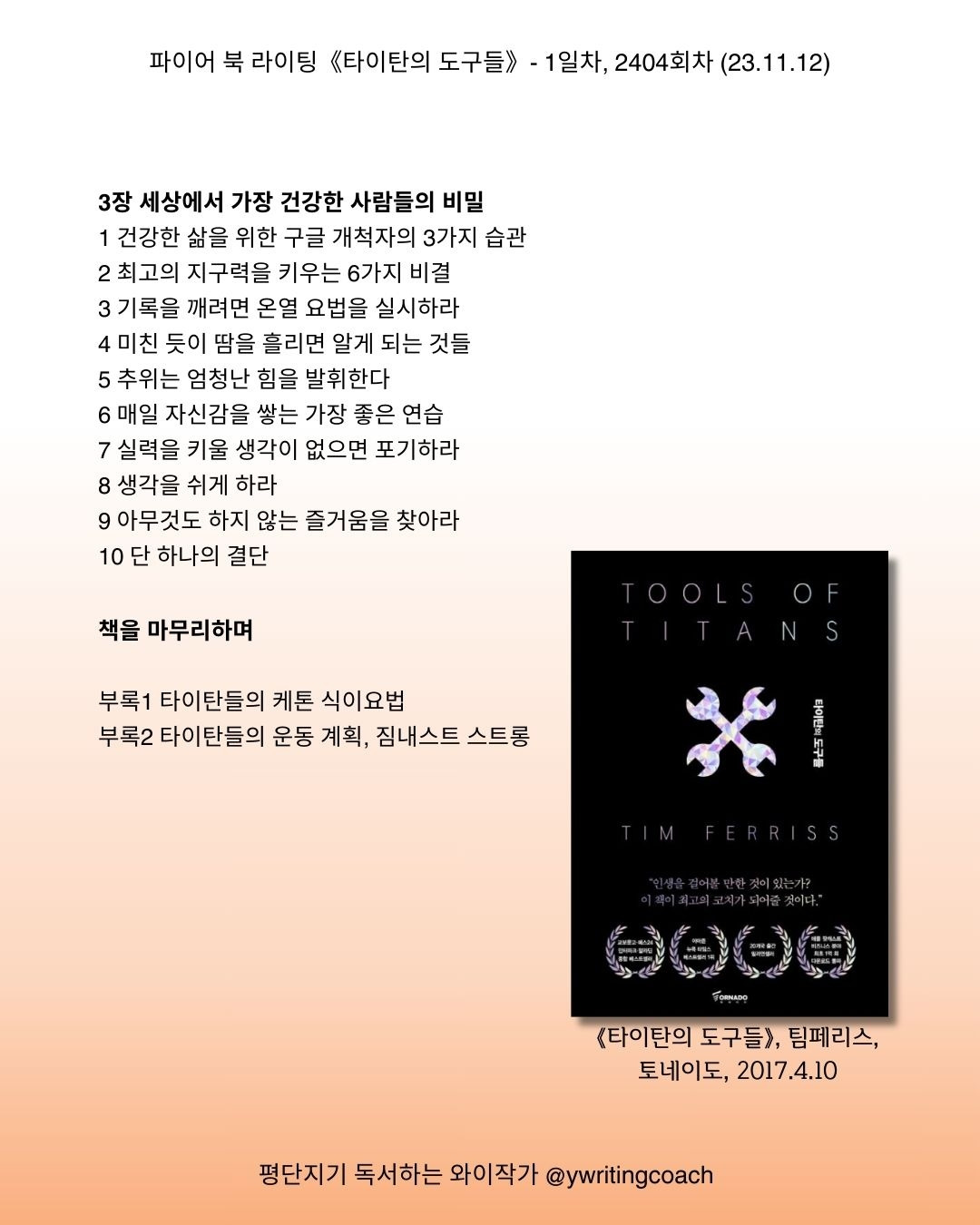 2023년 평단지기 독서 스물세 번째 선정도서는 장기 자기 계발 베스트셀러인 팀 페리스의 《타이탄의 도구들》로 선정했습니다. 2018년 2월 재테크 카페에서 필독서로 선정한 책이었거든요. 5년이 지난 지금, 타이탄의 도구들 중에 어떤 것이 제 걸로 장착되어 있는지, 놓치고 있는 건 무엇인지 살펴보기 위함입니다. 2018년 2월은 조급한 마음으로 부자, 성공한 사람이 되기 위해 읽었다면, 2023년 11월은 팀페리스, 작가의 관점을 배워보려고 재독 합니다.