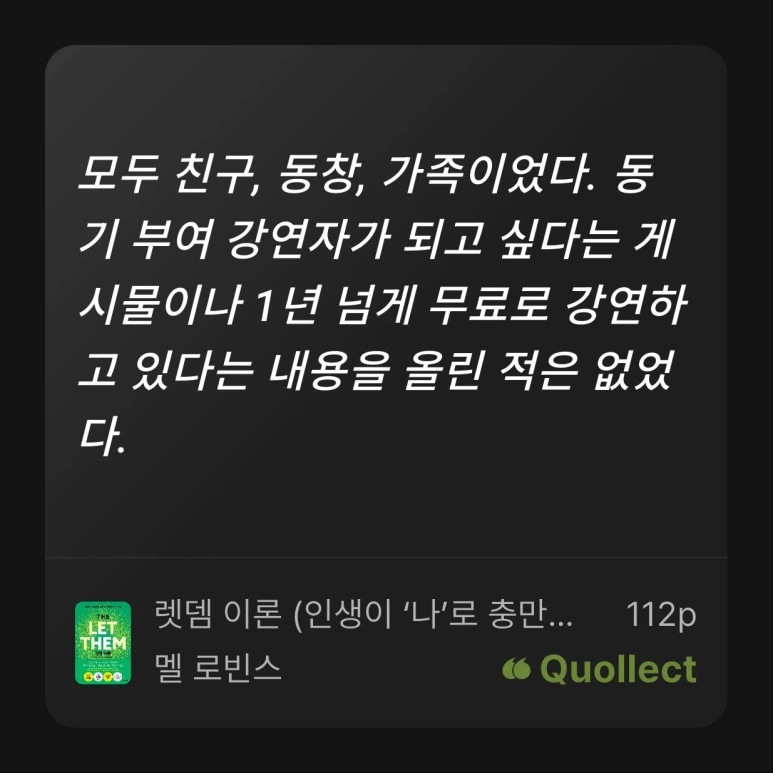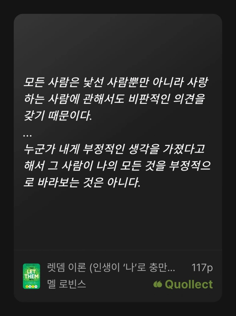 저도 릴스나 유튜브 영상에 제가 책을 소개하거나 독서모임 하거나, 강의 하는 걸 올려보고 싶은 데, 다른 사람들의 비판을 두려워하고 있었다는 사실을 깨닫게 해주네요.