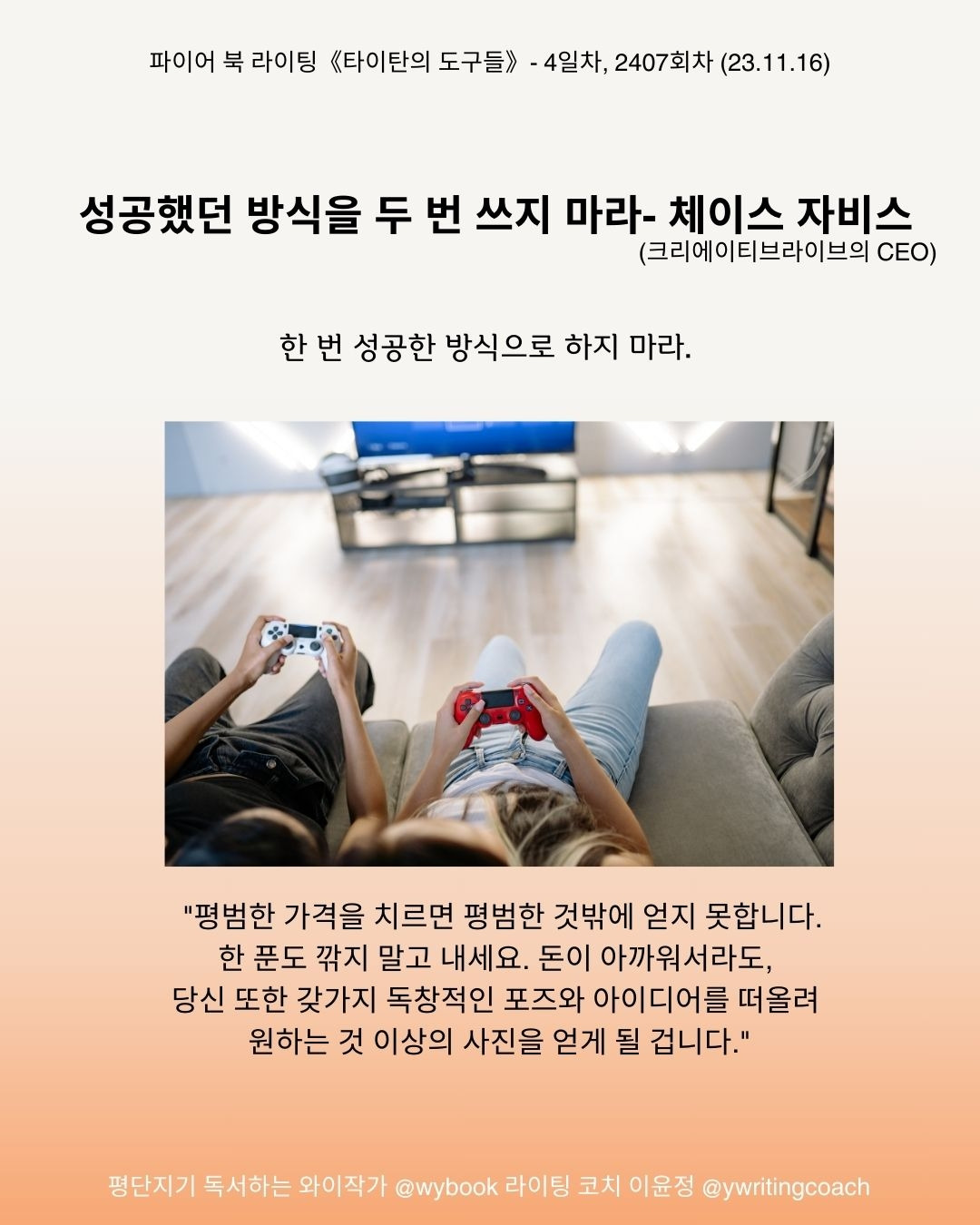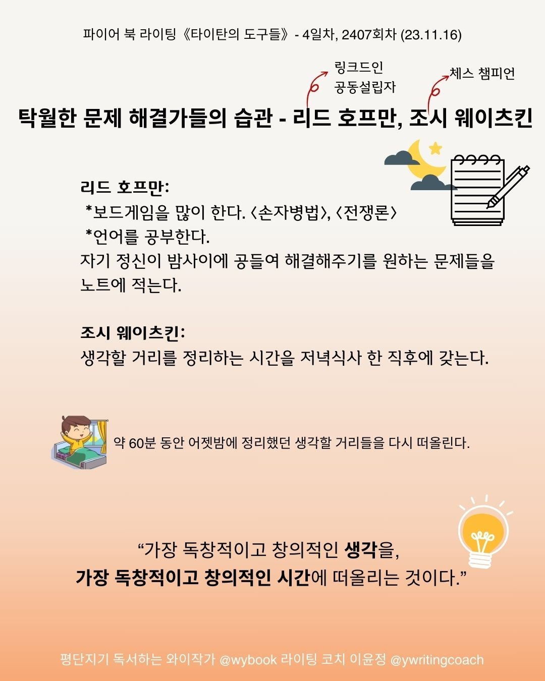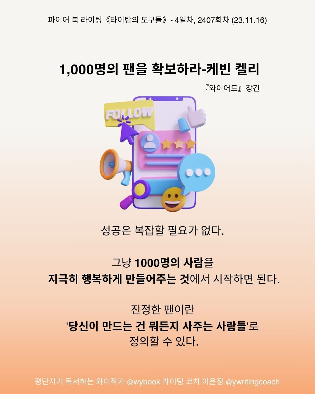 드디어 만났다. 줄리아카메론의 《아티스트 웨이》를 자이언트 북 컨설팅 천무에서 소개받아 읽게 되었다. 내 경우에는 자기계발서와 경제경영서 위주로만 읽다 보니 편협된 범위의 책을 주로 읽는 편이었다. 천무 덕분에 글쓰기 관련 책을 읽기 시작했고, 《아티스트 웨이》에서 알게 된 모닝 페이지와 아티스트 데이트의 위력을 깨달을 수 있었다. 다양한 분야의 책을 읽고, 내 걸로 만들어야 한 단계 높은 전문가, 상위 단계로 올라갈 수 있다. 《딜버트》의 저자 스콧 애덤스 이야기도 2018년 《타이탄의 도구들》 을 읽을 땐 몰랐던 사람이다. 2020년에 《더 시스템》이 출간되면서, 다시 타이탄의 도구들에 언급되었던 저자라는 걸 알게 되었다. 《더 시스템》을 읽을 당시에는 체중감량에 관심이 있었는데, 몸무게 몇 kg을 빼는 게 아니라 시스템을 만들어야 한다는 내용이었다. 이 책은 나눔마린님이 추천했던 기억이 나서 읽었었다, 함께하는 다이어트를 하면서 읽기 시작했다. 그래서 내게는 '건강' 유지하는 방법으로 각인되어 있는 책이다. 타이탄의 도구들에 스콧 애덤스의 블로그를 글쓰기 연습으로 활용하는 시스템, 체계로 활용하고 있다는 글이 2023년 11월에 보였다. 그리고 더 신기한 건 스콧 애덤스도 블로그에서 글을 쓰며 R&D 공간이라고 표현했다느 사실이다. 실은 내가 연구원이었다. 연구원이란 Research&Develope의 약자로 R&D이다. 언어의 유희로 《평단지기 독서법》에서 우연히 #RnDiToday 해시태그를 붙여두었다. 발음이 R&D와 RnD가 동일해서이다. 연구원이라는 직업과 독서를 연결해서 Read, note, Do It, Today!로 평단지기 독서법을 설명했기 때문에, 스콧 애덤스와 겹치는 생각을 한 것이 재밌다는 생각이 들었다. 1000명의 팬을 확보하라는 이야기는 팀 페리스가 이야기한 게 아니라 <와이어드>를 창간한 케빈 캘리였는지 몰랐다. 2006년 버전을 2016년 버전으로 바꿔 주었다는데, 지금은 2023년이다. 인플루언서 전성시대가 되었다. 인스타그램에서 10K, 블로그에서도 10K는 흔히 볼 수 있을 정도의 세상이 되었다. 하지만 수십만, 수백만 팔로워를 보유했다고 해서 그들이 인플루언서의 상품을 구매하는 건 아니다. 최근에 드로우 앤드류의 자기 계발 키트 가격 논란이 있었던 것 같다. 드로우앤드류의 자기 계발 키트 가격이 약 13만 원대로 측정되었기 때문에 고가 논란에 휩싸인 듯 보인다. 드로운 앤드류는 급히 영상을 찍어서 제품별 원가를 공개하고, 제품의 '질'을 높이기 위한 합당한 가격이라고 주장했다. 사업이 보통 그렇다. 싼 가격에 맞추면 질이 떨어져서, 마음에 안 들어하는 사람이 생긴다. 고객은 비싸도 구매한다는 말이 있다. 개인적으로는 양질의 제품이 합당한 가격에 나오는 걸 더 선호하는 편이다. 소량 제작 시 가격이 올라가기 때문에. 다이어리와 노트는 특히나 종이 재질을 중요시한다. 한때는 모닝글로리와 양지 다이어리를 선호하곤 했다. 팔로워를 많이 보유한 인스타 인플루언서들이 책을 출간하길래 서점에 가서 봤다. 4만 팔로워를 보유했음에도, 책이 베스트셀러 순위에 올라가지 못하고, 한 달 만에 책이 서가행이 된 것을 보았다. 지금 하와이 대저택임의 더 마인드라는 책도 예약판매 후 각종 서점사이트에서 1위를 달리고 있는데, 자기 계발 시장이 생각만큼 큰 건 아니다. 온라인에서는 알려져 있지만 5천만 대한민국 국민에 비해 40만 구독자의 책이 얼마나 지속되면서 영향력을 펼쳐나가는지가 요즘 내 관심사 중 하나이다. 어제는 밥 프록터의 부의 확신을 산책하며 들었다. 조성희님의 마인드셋이야기가 추천사로 나온다. 밥 프록터의 후계자로 교육을 받았던 분인데, 마인드 셋을 강조하는 여자이고, 더 마인드는 남자가 강조하는 마인드 이야기여서 앞으로 어떻게 시장이 흘러갈까라는 질문이 생겼다. 드디어 타이탄의 도구들에서 글쓰기 관련 장절을 찾았다. 사실 이번에 재독 하기로 했던 이유가 줄리아 카메론의 이야기가 타이탄의 도구들에 나온다는 이야기를 듣고, 라이팅 코치로서 작가로서 그 내용이 궁금해서 읽게 된 것이다. 책을 읽을 때 목적이 다르면 내용도 다르다. 사람의 경험이 다르면 책도 다르다. 요즘 연필로 쓰기 김훈 작가의 책을 필사 중이다. "밥이 웬수고, 똥이 웬수였다"라는 글이었다. 어제 만든 어록이 생각난다. 나는 "책이 나였고, 글이 나였다."라는 형태로 나만의 어록을 만들어 봤다. 필사는 이렇게 나의 어록을 만드는 행위까지 필요하다. 지금까지 21분 27초가 걸렸다. 내 머릿속 의식을 고스란히 적어보았다. 평단지기 독서하는 내용이 요즘 시간이 많이 걸린다. 이번달 독서모임이 11월 28일인데, 월초에 다른 책을 읽어서 시간이 촉박해졌다. 독서리더이기에 완독해야 한다는 강박관념이 생겨서인데. 날짜를 쪼개 보니 대략 하루에 30페이지는 읽어야겠다는 생각을 해서이다. 그래서 하루분량이 30 페이로 정해졌고, 요약정리하는데도 20분 이상 소요되고, 이렇게 생각을 적다 보니 또 25분이 넘어갔다. 오늘 모닝페이지 끝. 아, 생각이 끝이 안 난다. 타이탄의 도구들을 읽은 지 4일 차인데, 매트의 잠자기 전 팔 굽혀 펴기 1회를 반복해서 보기 위해 글쓰기