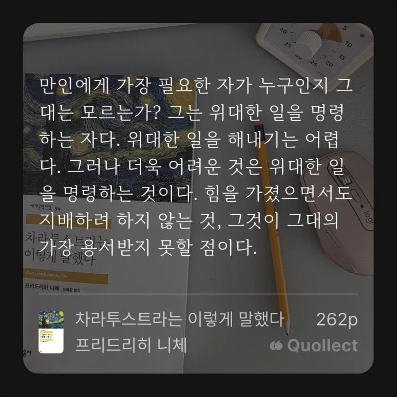 작가들이란 위대한 일을 명령하는 자와 같다. 힘을 가졌음에도 글을 쓰지 않는 것, 그것이 그대의 가장 용서받지 못할 점이라고 하는 니체의 말이 눈에 들어온다. 자신만의 경험의 힘을 글로 쓰고 있으니, 만인에게 필요한 자는 바로 작가가 아닐까. 니체 처럼 말이다.
