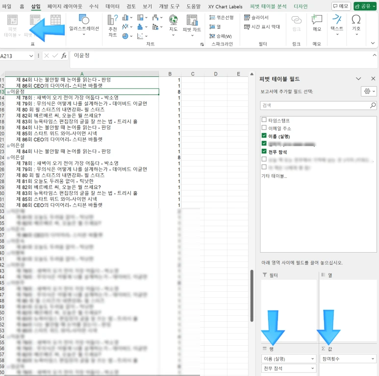 오늘 9회동안 있었던 독서모임 천무 참여 리스트를 정리했습니다. 매번 구글 설문지로 이름을 입력하고 책 제목을 선택합니다. 그렇게 모인 독서모임 리스트는 엑셀파일로 통합해요. 그리고 피봇차트를 활용하면 개인별로 몇 회 독서모임에 참여했는 지 순식간에 정리가 됩니다.