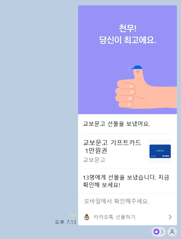 연속으로 독서모임에 출석한 작가님들을 비정기적으로 체크해서 교보문고 상품권 1만원 권을 선물로 주기로 했습니다. 물론 이은대 대표님이 쏘시는 선물이에요. 저는 대행만 합니다.