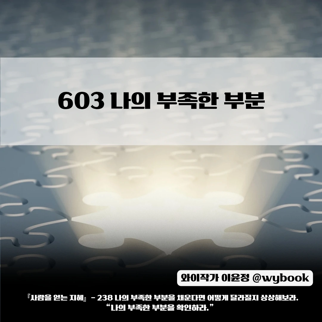 "나의 부족한 부분을 확인하라." 그 부족함이 없었다면, 온전한 사람이 되었을 사람이 많다. 그것이 채워지지 않고는 절대 완전한 수준에 이를 수 없다. 아주 조금만 개선돼도, 훌륭하게 될 사람이 있다.