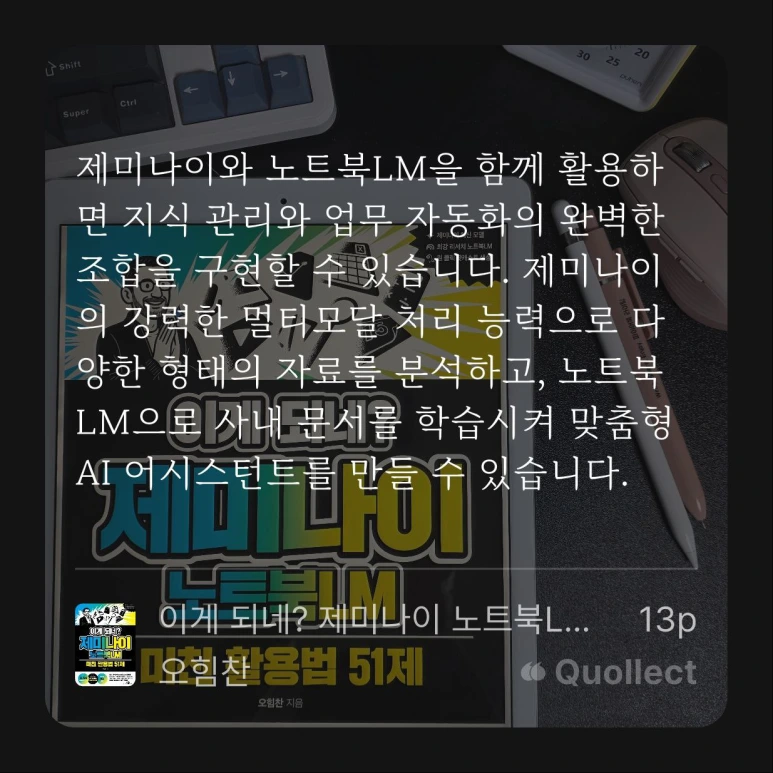 제미나이와 노트북 LM을 함께 활용하면 지식 관리와 업무 자동화의 완벽한 조합을 구현할 수 있습니다.