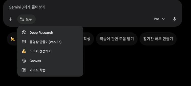 Deep Research, 동영상 만들기(Veo3.1), 이미지 생성하기 (나노 바나나), Canvas(캔바), 가이드 학습