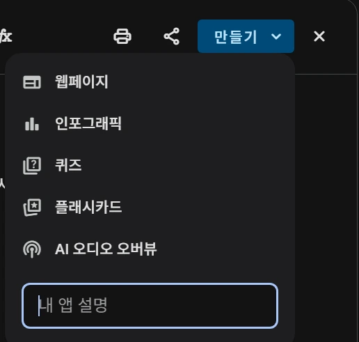 만들기- 웹페이지, 인포그래픽, 퀴즈, 플래시 카드, AI오디오 오버뷰