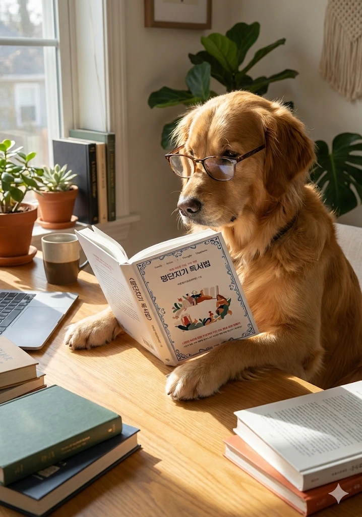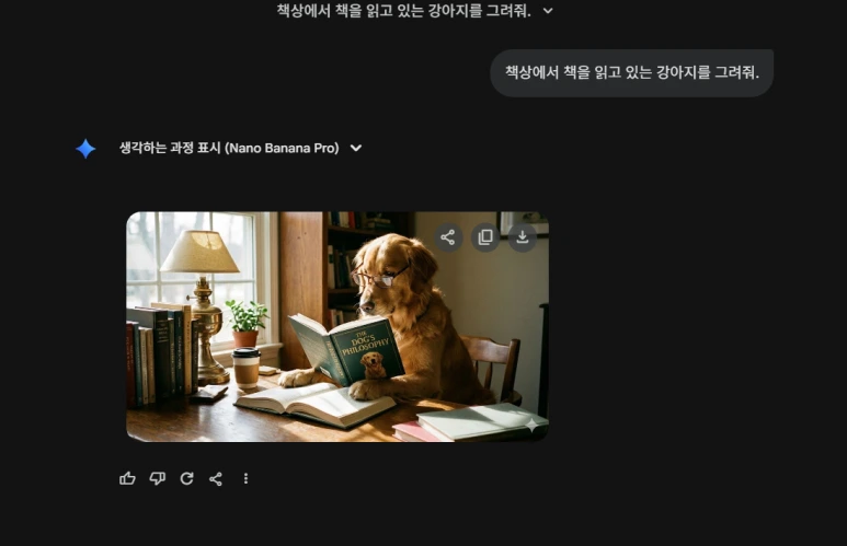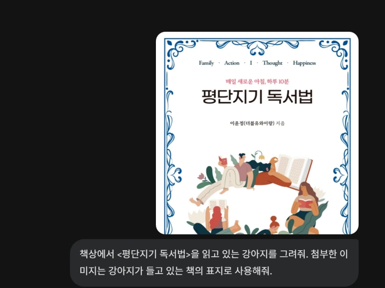 프롬프트에 "책상에서 책을 읽고 있는 강아지를 그려줘."를 넣으면 됩니다. '이미지, 그려줘, 그림'이라
