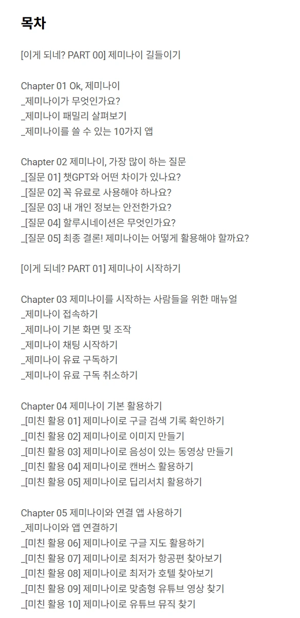 2024년 챗GPT를 공부한 이후로 챗GPT를 사용하고 있습니다. 구글 Gemini 3.0 출시 후 제미나이도 써봐야겠더라구요. 아무래도 구글 앱과 연동기능이 매력적입니다. 제대로 활용하는 방법을 51가지 배워보려고 해요. 이 책이 출시된건 25년 7월이라 그 이후에 더 업그레이드가 되었습니다. 몇 가지는 사라진 기능도 있어 보이고요. 이것저것 클릭해 보면서 제 걸로 만들어 보려고 합니다.