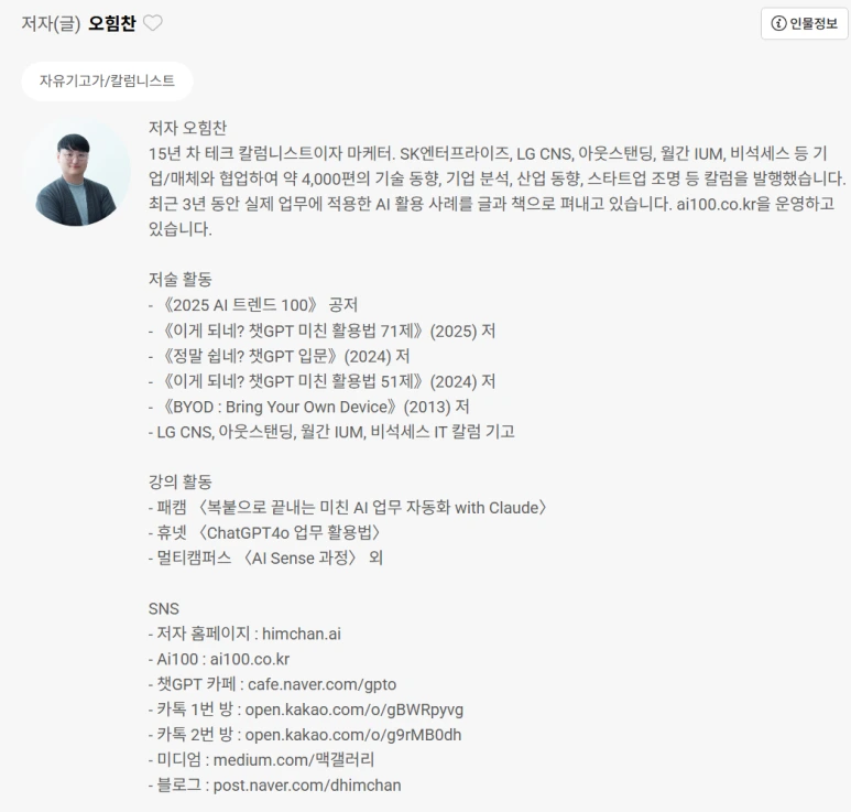 직장인 AI 미친 활용법 오픈카톡방도 있더라구요. 저자의 블로그와 홈페이지는 연결이 끊어져있네요.