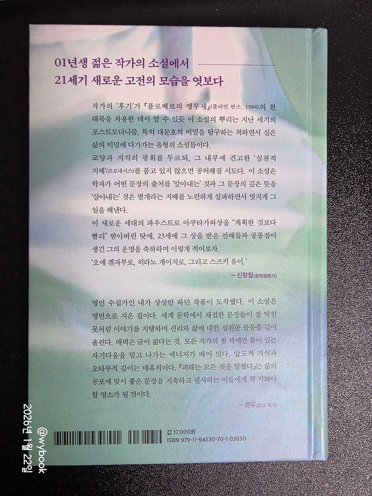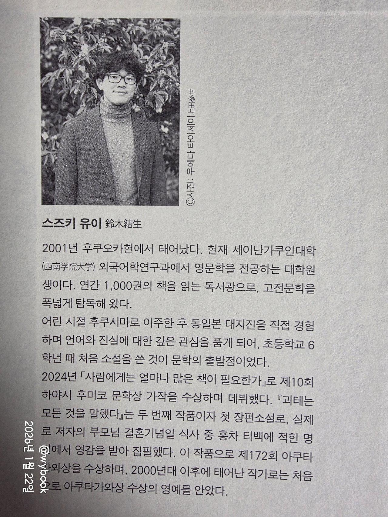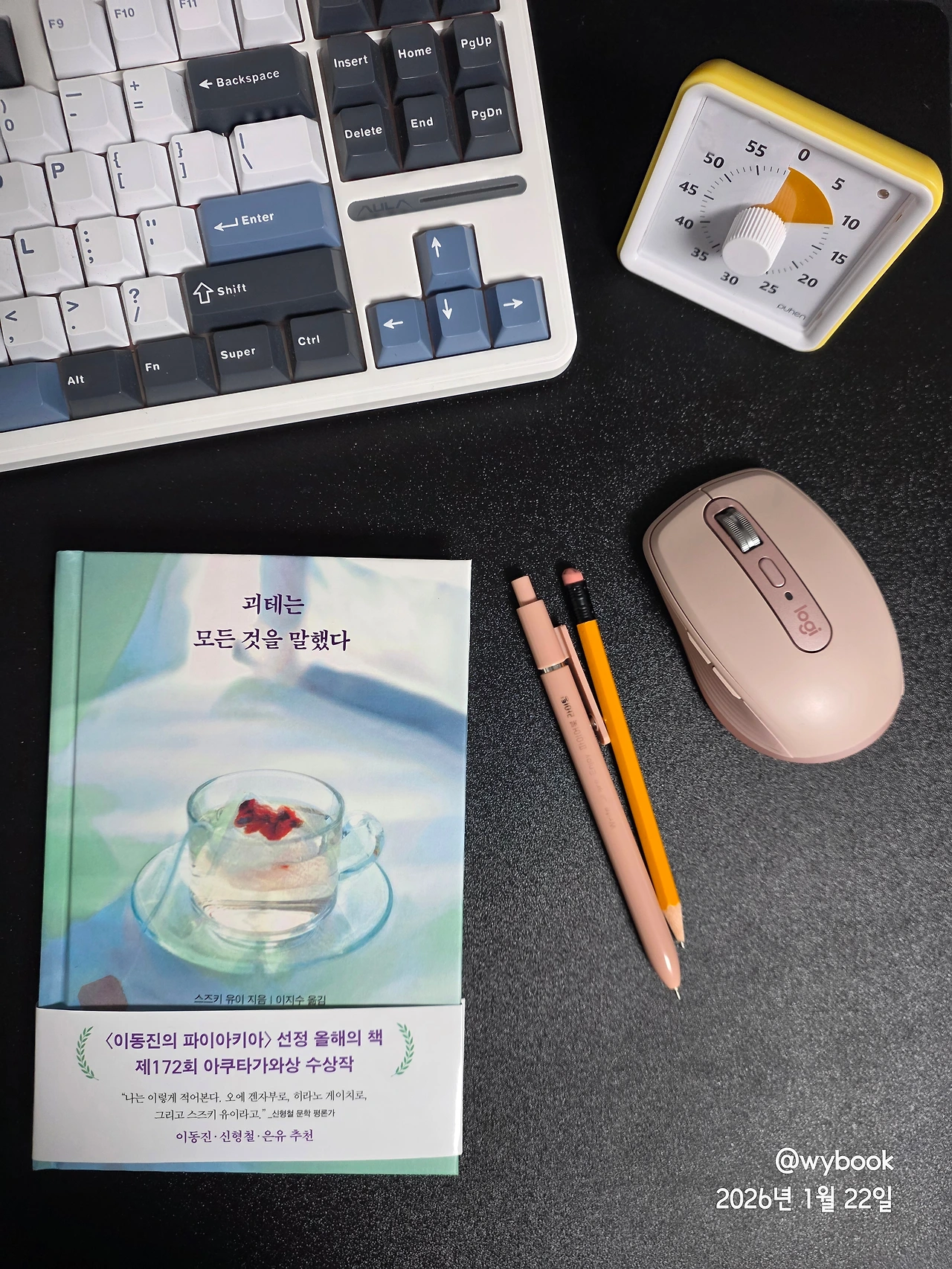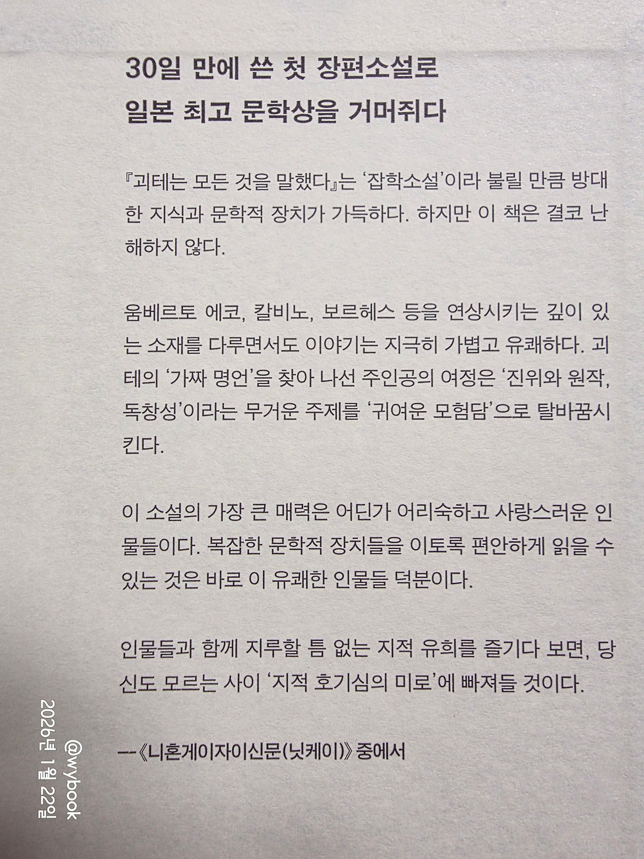"괴테는 모든 것을 말했다."로 시작하는 장인어른의 삶을 사위입장에서 쓴 소설책이다. 홍차 티백에 적혀있는 괴테의 명언찾기에서 스토리가 시작된다. 저자는 01년생, 1년에 천 권의 책을 읽는담다. 30일만에 쓴 책이 베스트셀러가 되었다. 궁금해서, 독서모임에서 선정되어 읽는다.