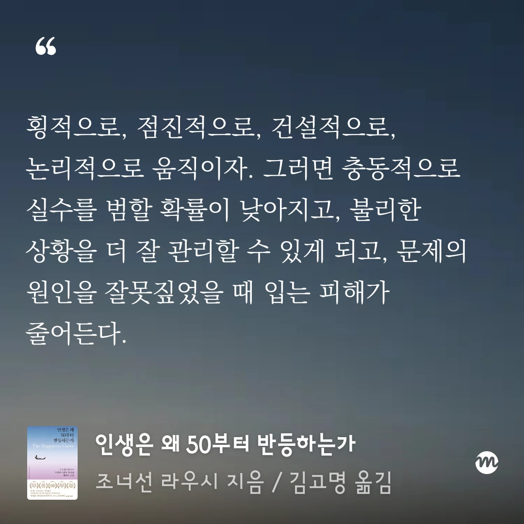 충동적인 상황에 빠지려고 할 때는 횡적,점진적, 건설적으로, 논리적으로 움직여서, 실수를 줄일 수 있다고 설명합니다.
