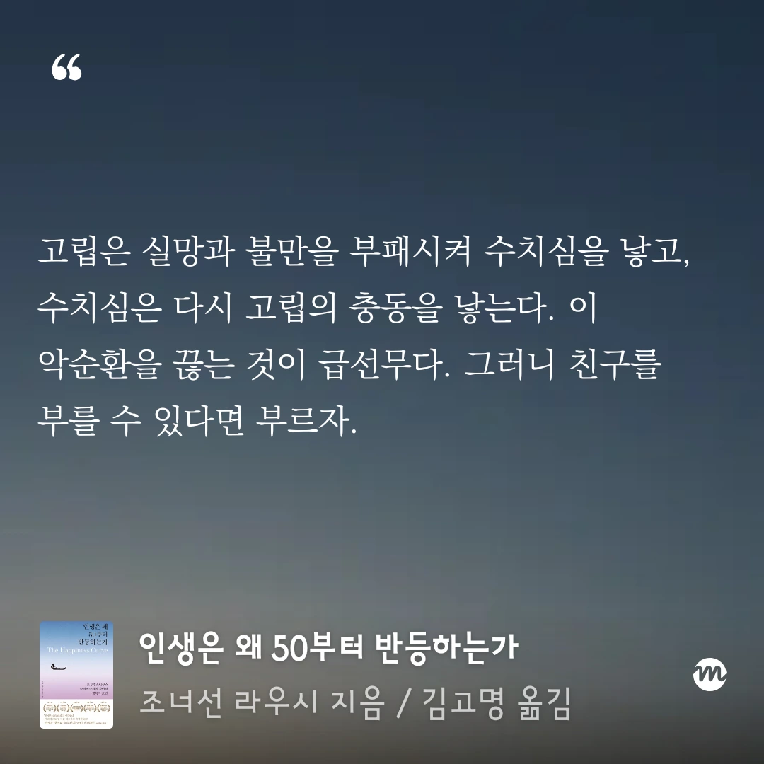 고립은 실망과 불만을 부패시켜 수치심을 낳고, 수치심은 다시 고립의 충동을 낳는다.이 악순환을 끝는 것이 급선무다. 그러니 친구를 부를 수 있다면 부르자.