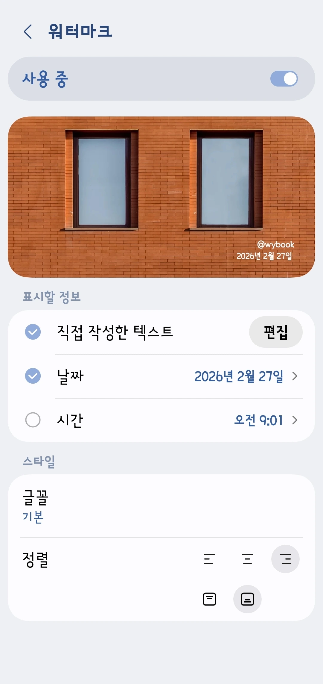 카메라 설정에서 워터마크- 텍스트와 날짜를 선택했다.