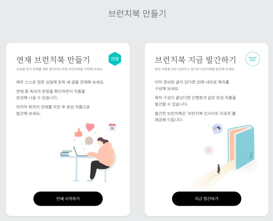 브런치 북은 2가지 있어요. 연재를 하거나 이미 준비된 글로 지금 발간하기라는 게 있습니다.