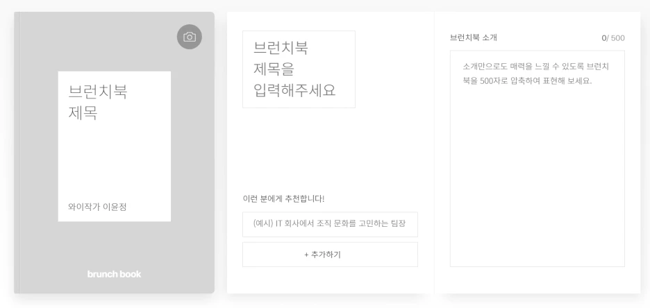 연재 브런치북 만들기를 누르면, 브런치북 제목, 이런 분에게 추천합니다! 브런치 북 소개 란이 있습니다.