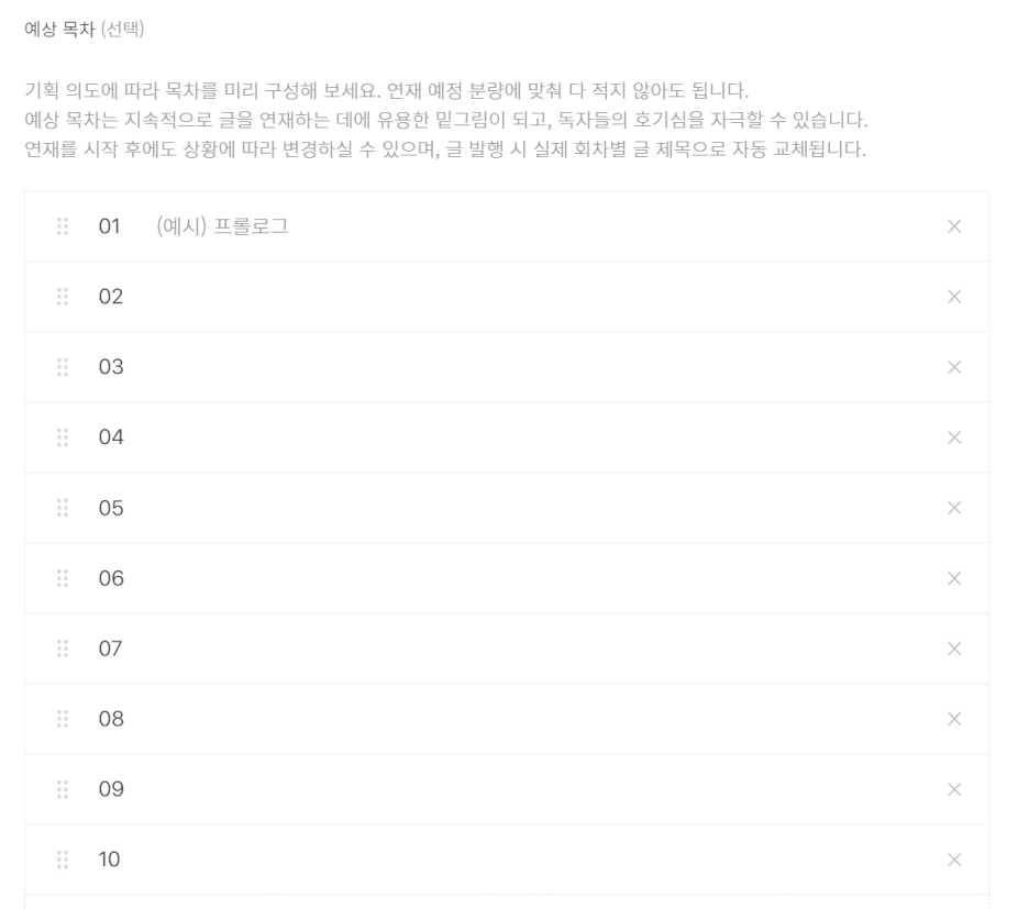 그리고 아래쪽에 예상 목차가 있어요. 기획 의도에 따라 목차를 미리 구성하는 거예요. 독자들의 호기심을 자극하도록 목차를 만들어서 다음 편도 기대하게끔 만드는 일입니다. 연재 시작 후에 상황에 따라 바꿀 수도 있어요. 글 발행 시 제목이 자동으로 바뀝니다.