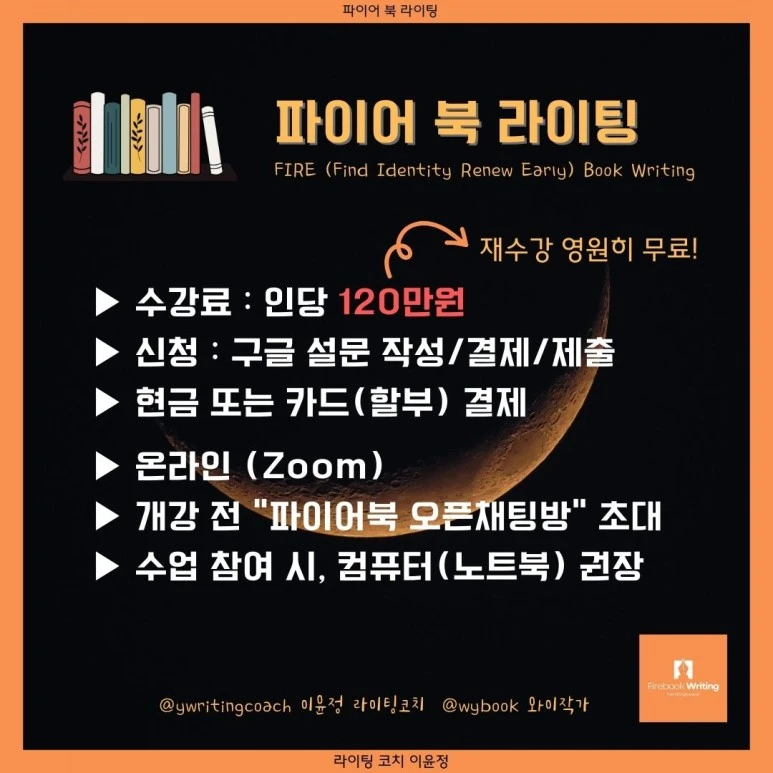 와이작가 이윤정 라이팅코치입니다. 파이어 북 라이팅 6월 책 쓰기 정규 과정 안내합니다. 수업은 온라인 실시간으로 진행합니다. 여타 다른 글쓰기 수업처럼, 녹화본 수업을 제공하지 않는 이