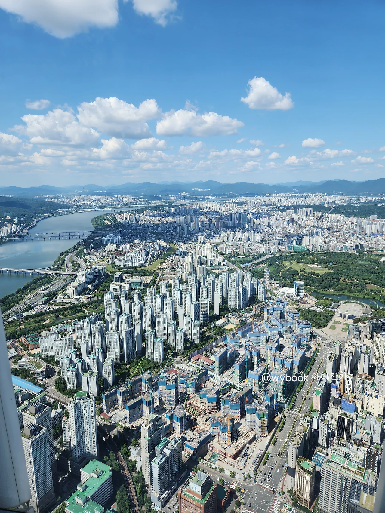 커피가 나오기 전부터 주변 사진을 계속 찍었습니다. 셀카도 찍고, 동영상도 찍고요. 커피가 나온 뒤엔 커피 마시면서 바깥 풍경을 즐겼습니다. 멍 때리면서요. 남편은 핸드폰을 보고 있길래, 여기서 왜 핸드폰을 보는 거냐고 한 마디하고는 그냥 내버려 두고 저는 올림픽 공원 쪽과 그 너머에 있는 산과 한강을 바라보며 여유를 부렸죠. 제가 좋아하니 남편도 좋다고 합니다.