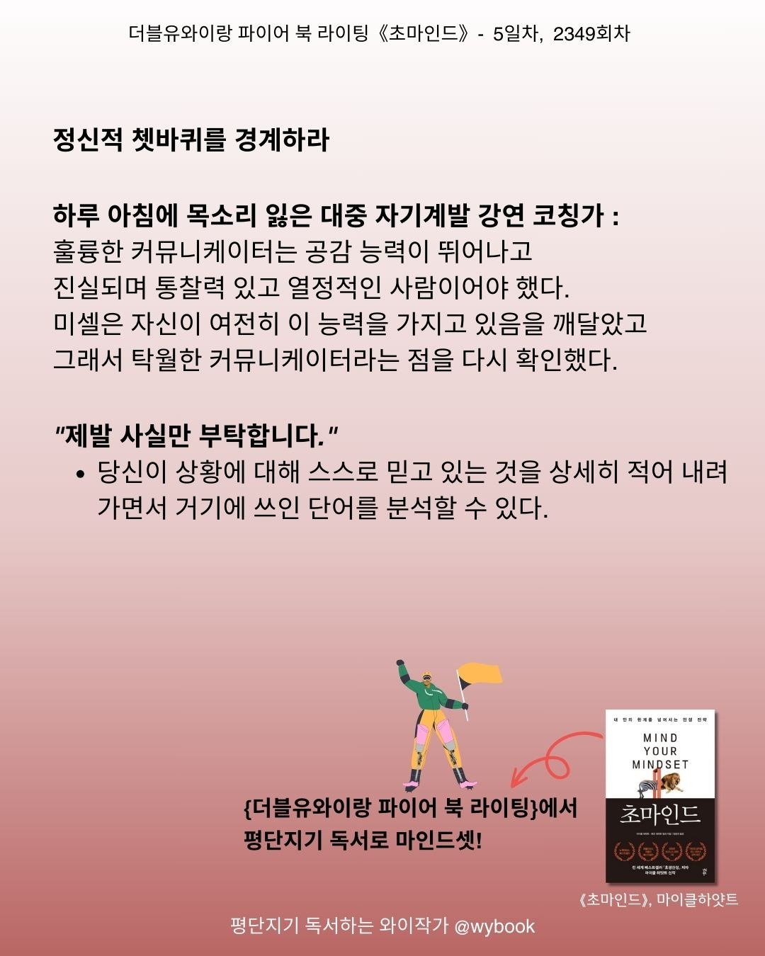 오늘생각: 대중 자기계발 강연 코칭가 미셸 쿠쳇은 간호사였다. 밝고 경쾌한 목소리 덕분에 10년간 자기계발 동기부여 커뮤니케이터 전문가가 되었다. 하지만 하루 아침에 편평상피암 항암치료 혀의 2/3를 잘라내야 했다. 그러자, 예전 목소리가 아니었다. 사람들의 비평과 험담에 좌절하는 순간이었다. 그녀는 질문했다. 나는 누구인가, 커리어를 바꾸어야 할까? 대중 연설 코칭 강사, 컨설턴트 혹은 대중 강연자로 먹고 살 수 있을까?