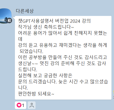 약 4주 동안 저 포함 10명과 함께 챗GPT스터디를 진행하고 오늘 온라인 책거리를 했습니다. 약 4주 동안 제가 어떻게 바뀌었냐면요. 신념이 챗GPT 사용설명서를 읽기 전과 후가 180도 바뀌었습니다. 남편이 저한테 챗GPT 전도사 아니냐고 할 정도로요. 지금은 두 번째 신념에 대한 증거를 찾기 위해 확증 편향적인 자료를 찾고 실습해 보는 중입니다. 물론 오류가 있지만, 어떻게 사용하느냐에 따라 결과가 다르게 나온다는 걸 인정하니, 제가 더 공부해야 한다는 결론을 내릴 수 있었습니다.