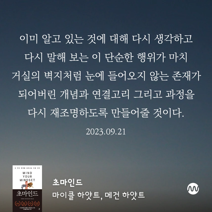 오늘행동: 새로운 답변 찾아보기 평단지기 독서법 2023-18차, 2352째, 마이클 하얏트 , 메건 하얏트 밀러 , 《초마인드》, 304p, 8일차 Share! *Write! * Enjoy! = 파이어 북 라이팅