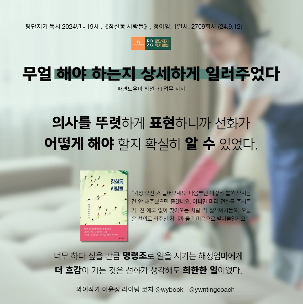 같은 아파트에 살지만 사람들마다 생각이 다르다는 걸, 업무지시는 명확하고 또렷하게 의사를 표현해야한다는 걸 배우는 시간이었습니다. 인간 본성이 잘 드러나 있는 책이라 글쓰기에 도움도 되고, 잠실동이 아파트가 머리속에 그려지니 재미있네요.