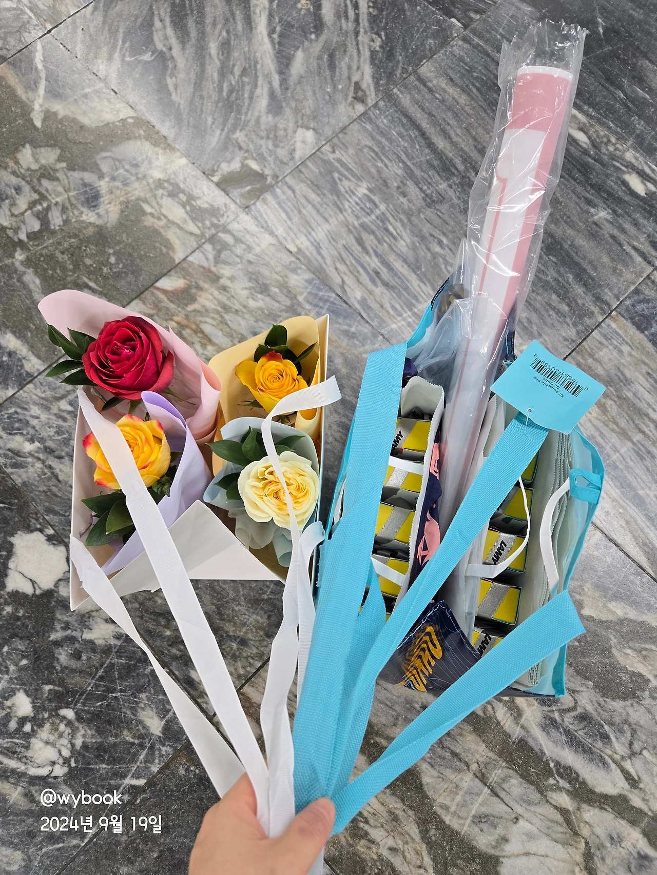 챙길 것들이 많으니 차를 가져가라고 조언해주네요. 만남장소 인근에 주차장을 찾아봤습니다. 유료 주차장이 있긴 했어요. 비용을 지불하더라도 가져갈까 생각했는데. 혹시라도 만차라 주차를 못하면 어쩌나 걱정이 되더라고요. 결국 백팩으로 바꿔서 노트북과 준비물을 가방에 넣었습니다. 지하철 타고 이동할 수 있을 정도의 부피로 줄었어요. 지하철 상가에서 제가 좋아하는 젤리 한 봉지 사고요. 옆에 꽃집도 있어서 꽃도 네 송이 장만했습니다. 오늘 너무 더웠잖아요. 목이 말라서, 편의점에 들어가 음료수도 6병을 샀지요.