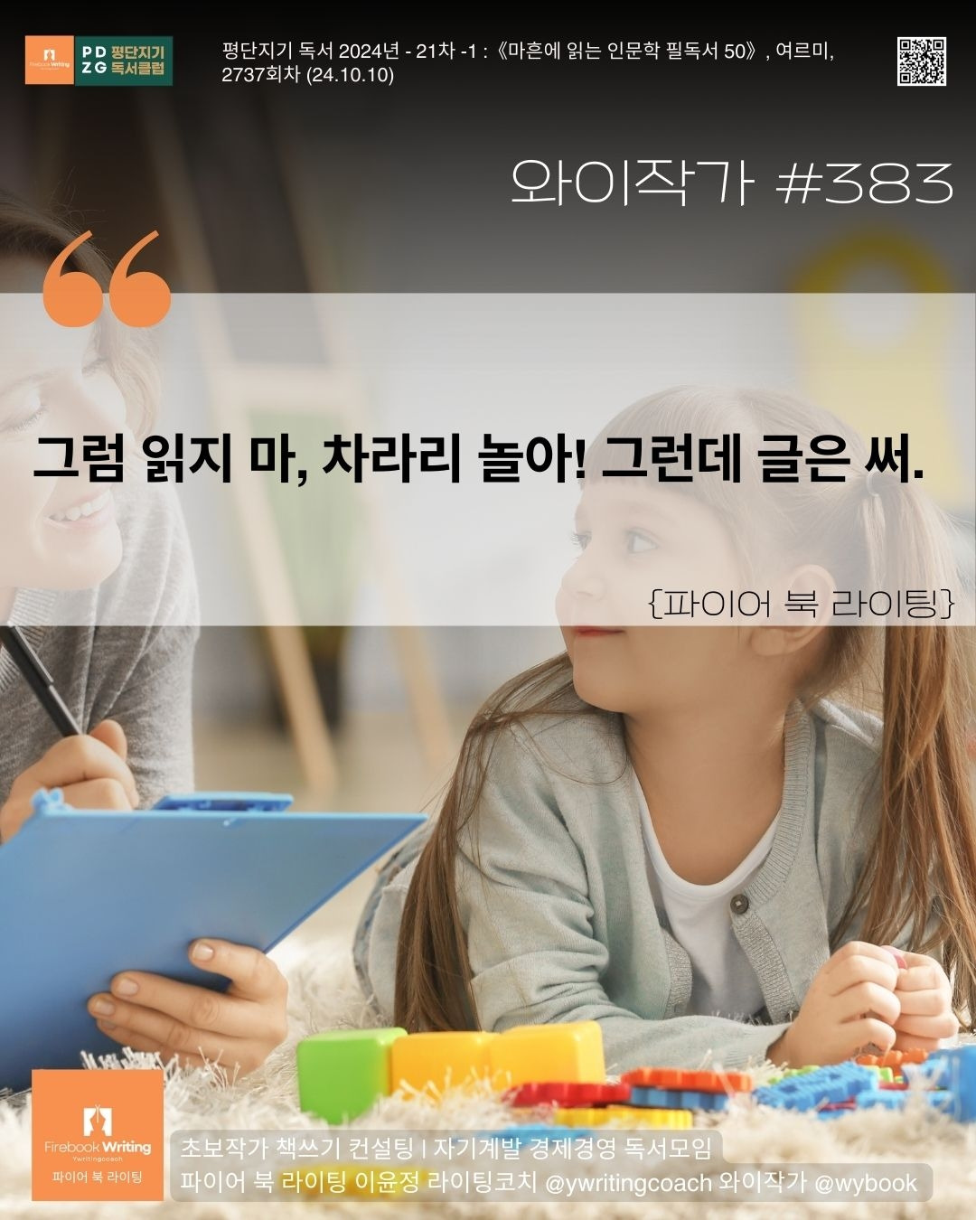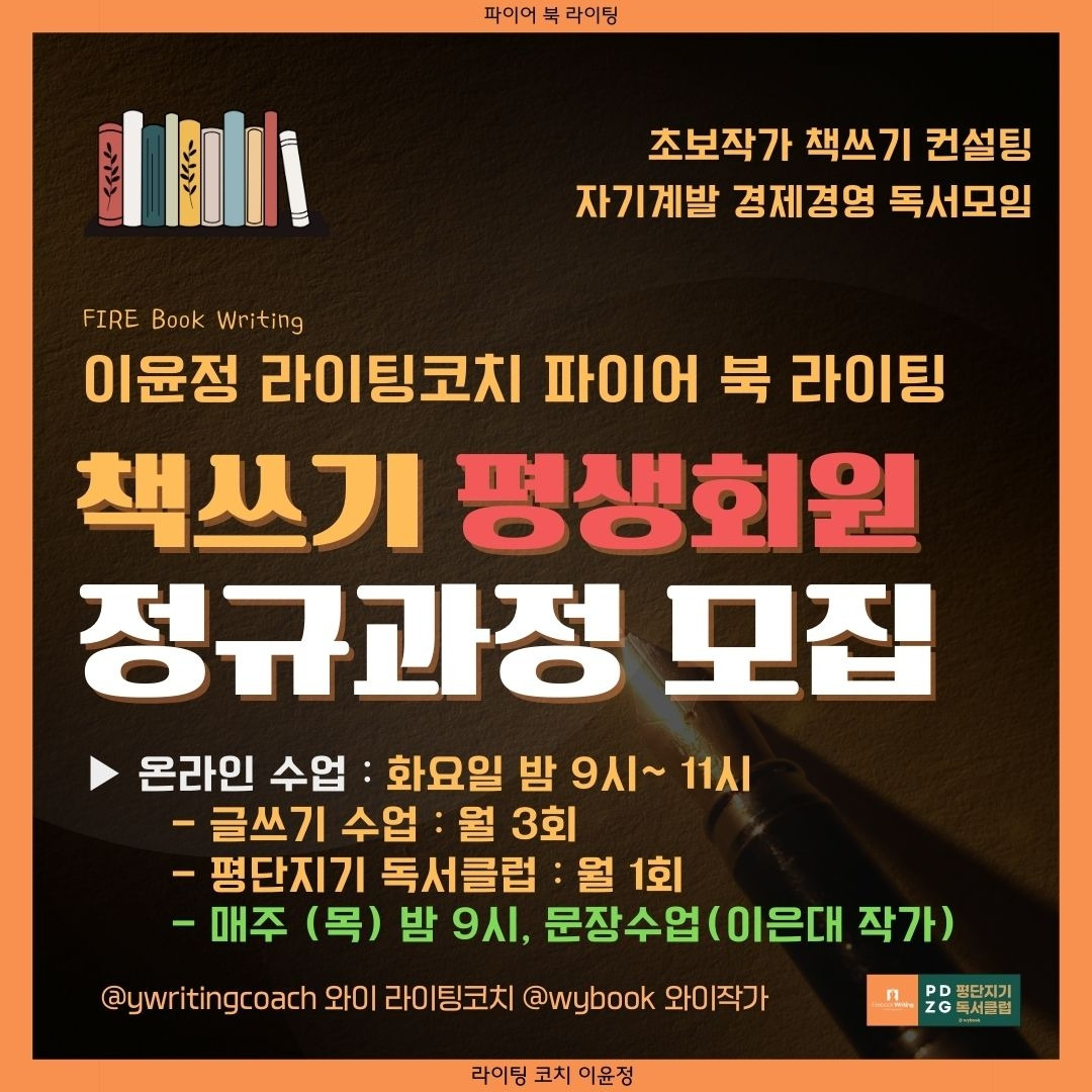 24년 11월 책쓰기 과정 - 파이어 북 라이팅 18기 안녕하세요! 퍼레이터(Personal 맞춤형 책 큐레이터) 와이작가 이윤정 라이팅코치입니다. 파이어 북 라이팅 11월 책쓰기 정규 과정 안내 수업 개요 이 과정은 파이어 북 라이팅의 평생 회원제 정규