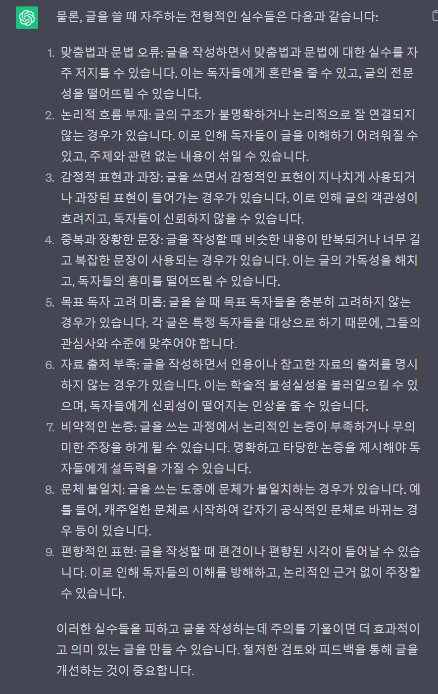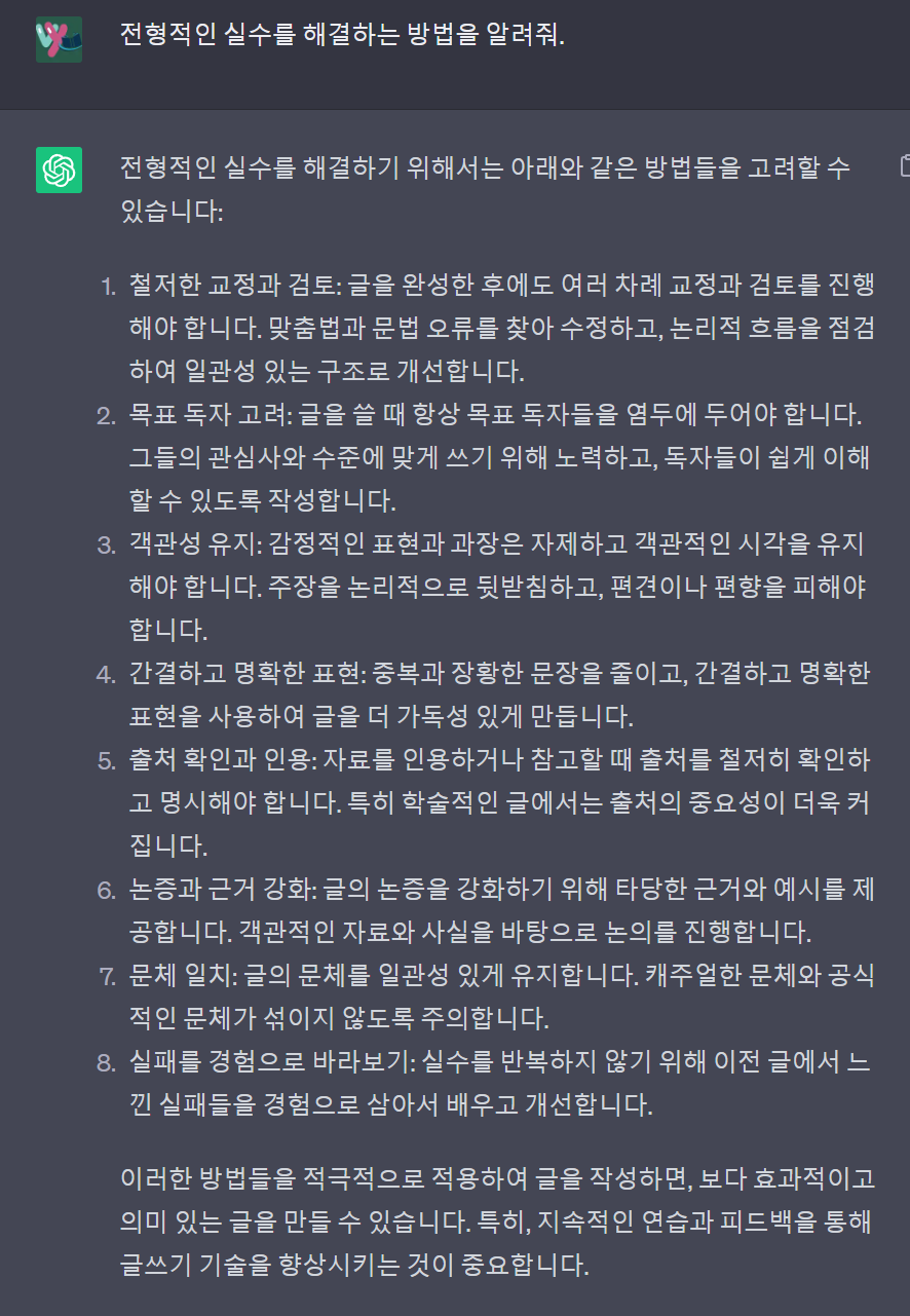 "글을 쓸 때 자주 하는 전형적인 실수를 적어주세요"라고 챗 gpt에게 물어봅니다.