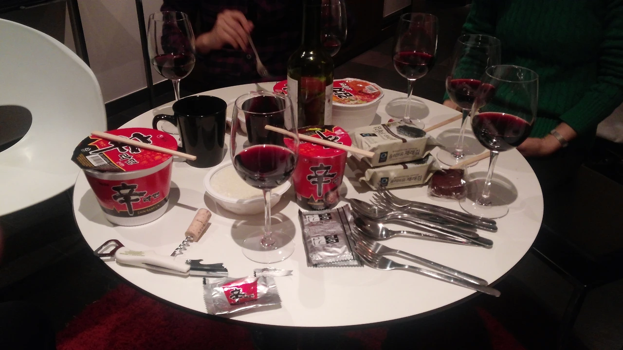 2014년 12월 6일 마드리드의 한 호텔. 밤 늦게 도착해한국에서 가져 온 컵라면에 웰컴 와인을 곁들이며 스페인 여행을 시작했다.