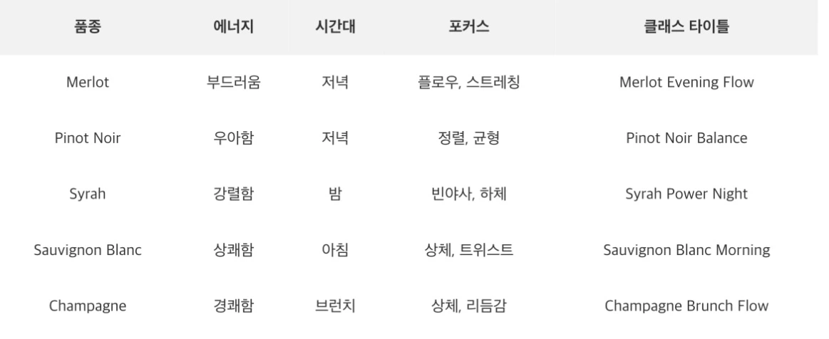 AI 시대 요가강사는 요가수업을 기획하는 데 AI(나는 Perplexity를 쓴다)를 적극적으로 활용할 수 있다. 요즘은 AI와 함께 와인요가 수업을 기획하고 있다. 타깃은 퇴근 후 힐링이 필요한 30~40대 직장인들로, 인사와 오늘의 와인 소개-호흡과 명상-메인 요가 플로우-사바아사나-와인 테이스팅-공유와 마무리 멘트로 구성된 90분짜리 스페셜 클래스다. 미디엄 바디에 부드러운 탄닌, 벨벳 텍스처, 부드러운 피니시가 특징인 메를로(Merlot)는 긴장을 풀어주는 Evening Soft Flow’로, 라이트 바디에 높은 산도, 낮은 탄닌, 우아하고 섬세한 스타일의 피노누아(Pinot Noir)는 디테일과 정렬 중심의 ‘Alignment & Balance Flow’로 포도 품종별 요가맵도 만들었다.