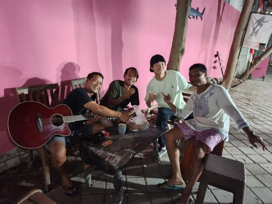어둠이 내린 길리섬은 그 나름대로 흥겹다. 스크린에 빔을 쏘아 영화를 상영하는 곳도 있고, 버스킹 하는 거리의 악사들은 애절하게 노래를 부른다. 조금 걷다 보면 비치클럽에서는 쿵짝쿵짝 신나는 비트가 흘러나온다. 맛집을 찾아 피자를 먹고 숙소로 돌아가는 길, 어디선가 기타 소리가 들린다. 소리를 따라가 보니 아는 얼굴이다. 낮에 다음 목적지인 렘봉안 가는 보트를 예약했는데 거기 투어업체 사장님과 그의 친구들이다. 그들의 낭만에 끼고 싶어 나도 가서 아는 체를 한다.
