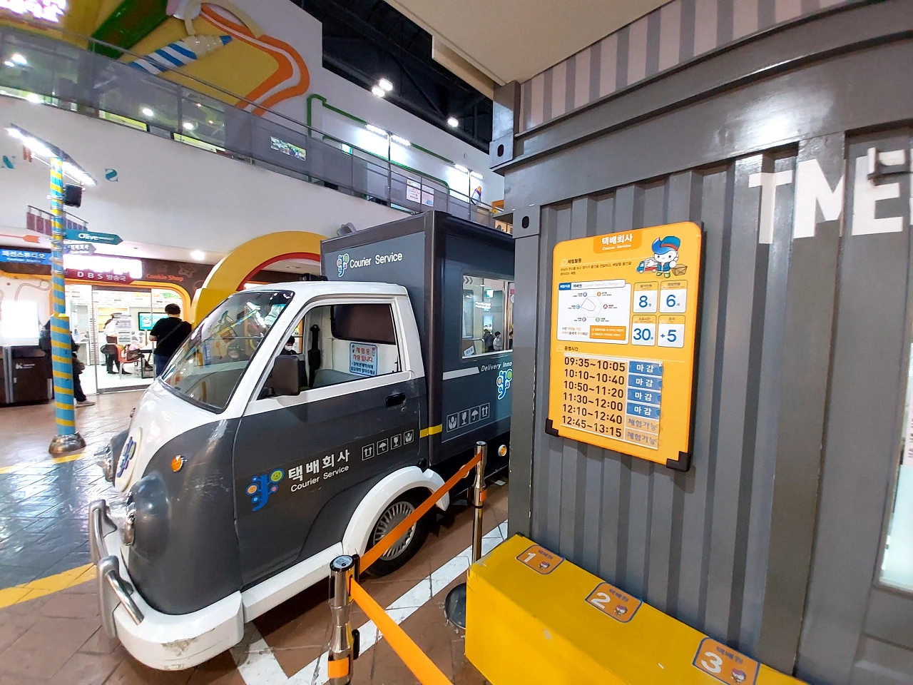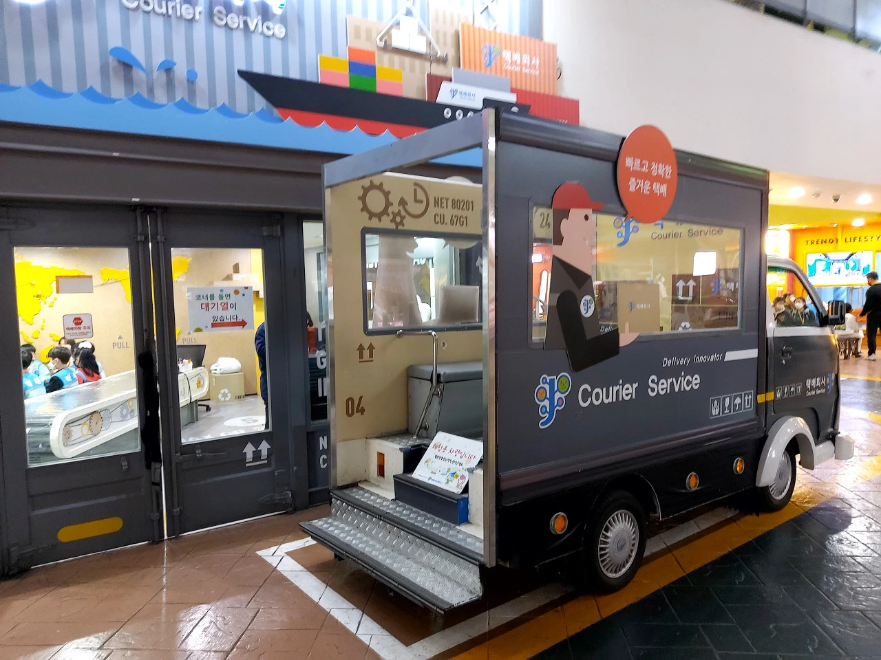 다음으로 마지막 체험 '택배기사'. 체험장 안 여기저기를 택배를 들고 다닐 수 있고, 전기차도 탈 수 있기에 아이들에게 인기가 많았다. 그 때문인지 우리가 도착했을 때는 원하는 시간이 마감된 상태였다. 아들은 아쉬워했지만 어쩔 수 없었다. 다른 곳을 찾아서 여기저기를 둘러보는데, 대부분이 마감된 상황이었다. 3층으로 올려가려는 순간, 택배기사 1자리가 비었다는 수신호가 눈에 들어왔다. 아들 손을 잡고 달렸다. 다행히 무사 도착. 운이 좋았다. 덕분에 아들이 본인이 원했던 3개 체험 모두를 할 수 있었다.